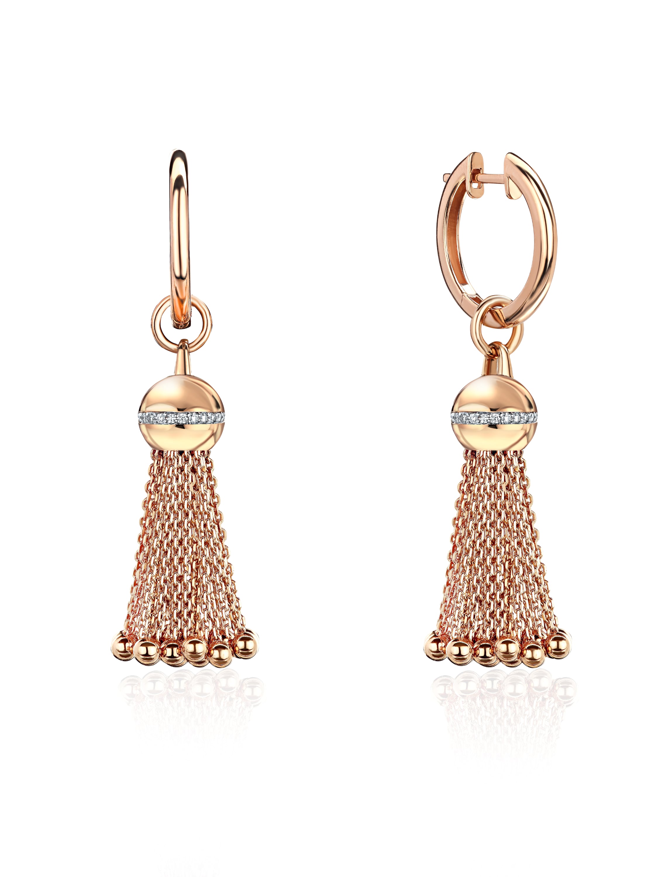 Small rose gold hoops with tassels and 52 round diamonds weighing 0.26 ct. Diameter: 1.5 cm. Item length: 5.5 cm.