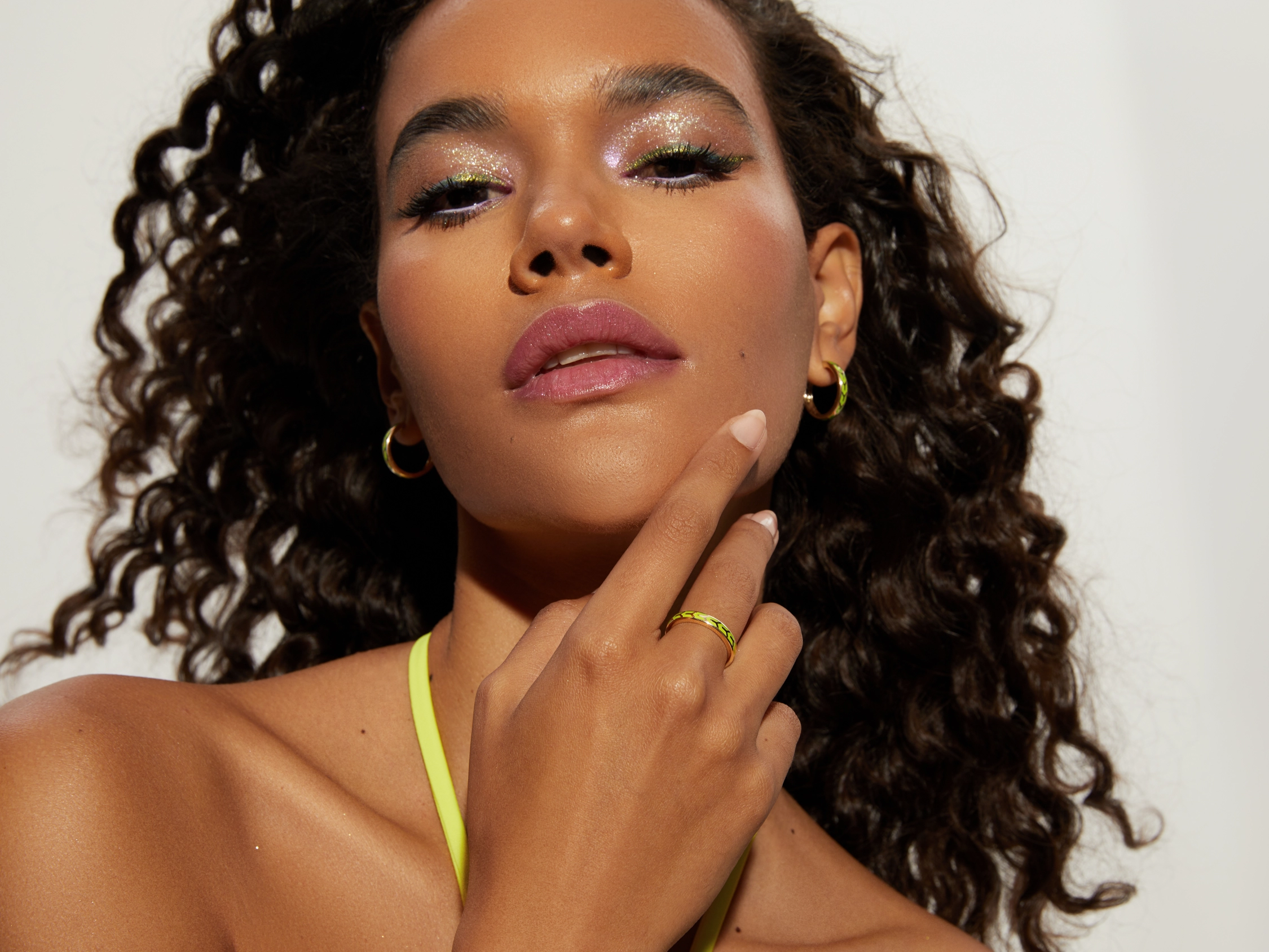 Small yellow gold hoops with lime-colored enamel. Diameter: 2.5 cm.