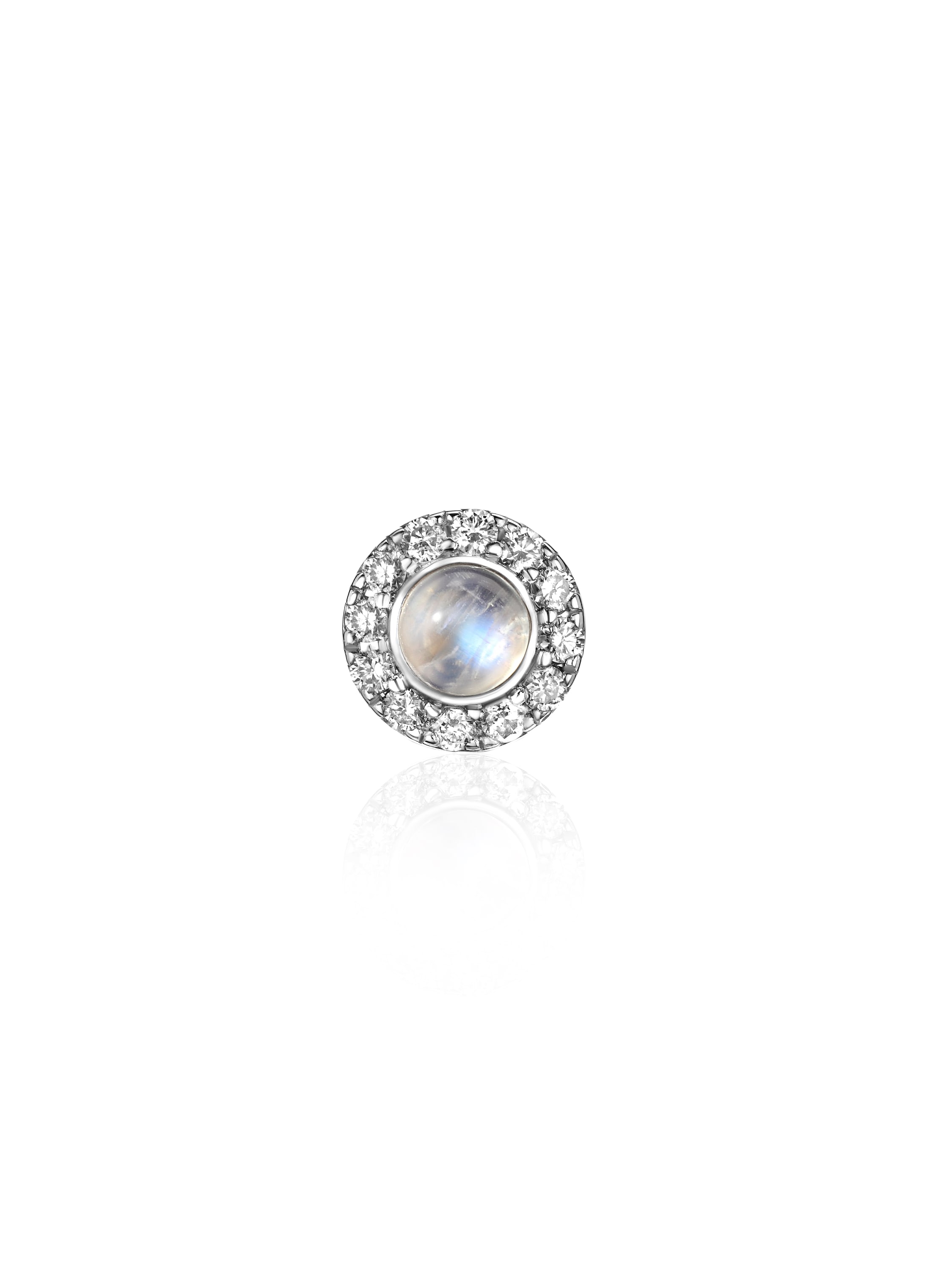 Single white gold earring with moonstone weighing 0.09 g and 12 round diamonds weighing 0.15 ct.