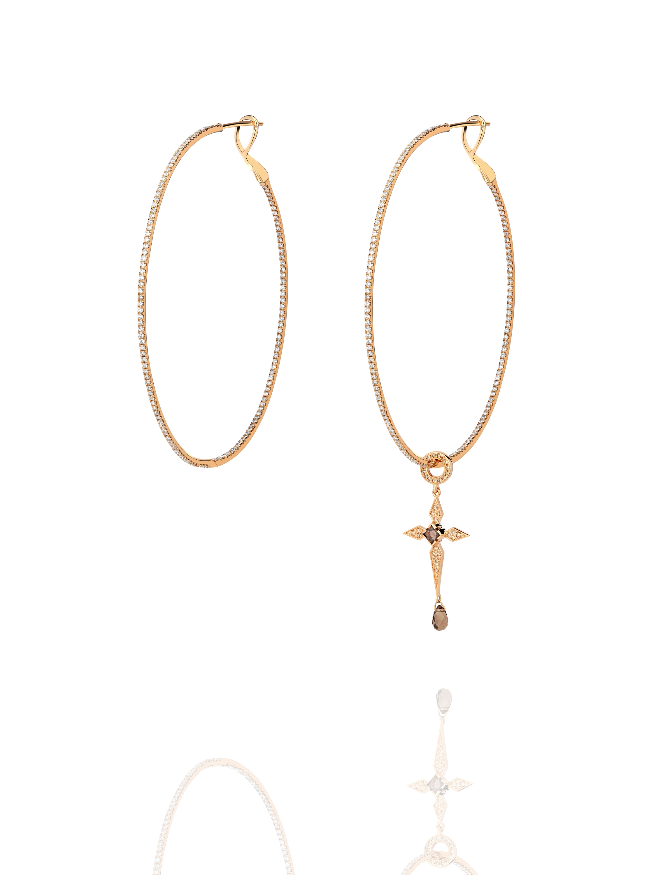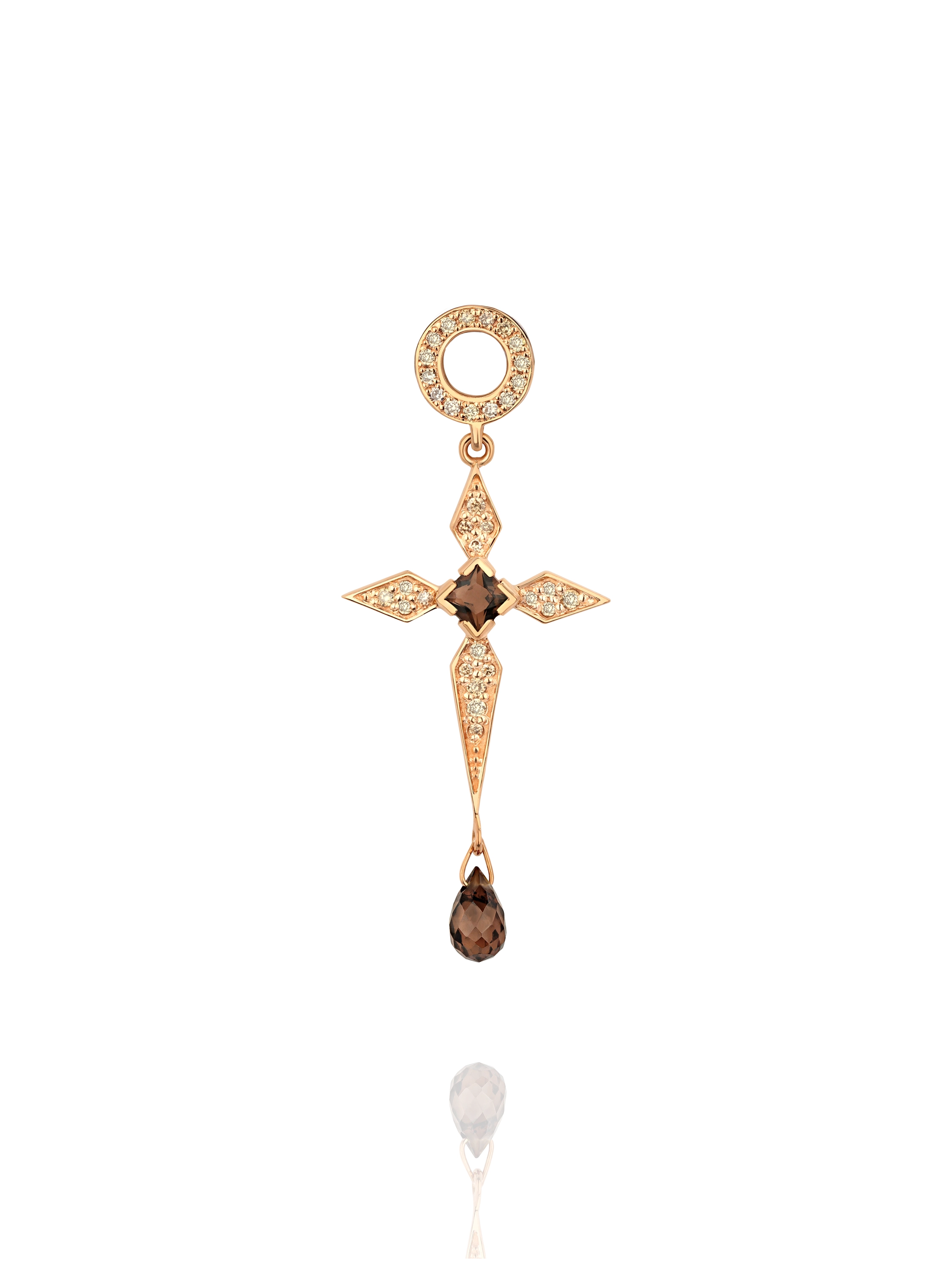 Pendant for hoops in rose gold with a 0.31 ct briolette-cut smoky quartz, a 0.13 ct square-cut smoky quartz, and 48 round-cut diamonds with a total weight of 0.17 ct.