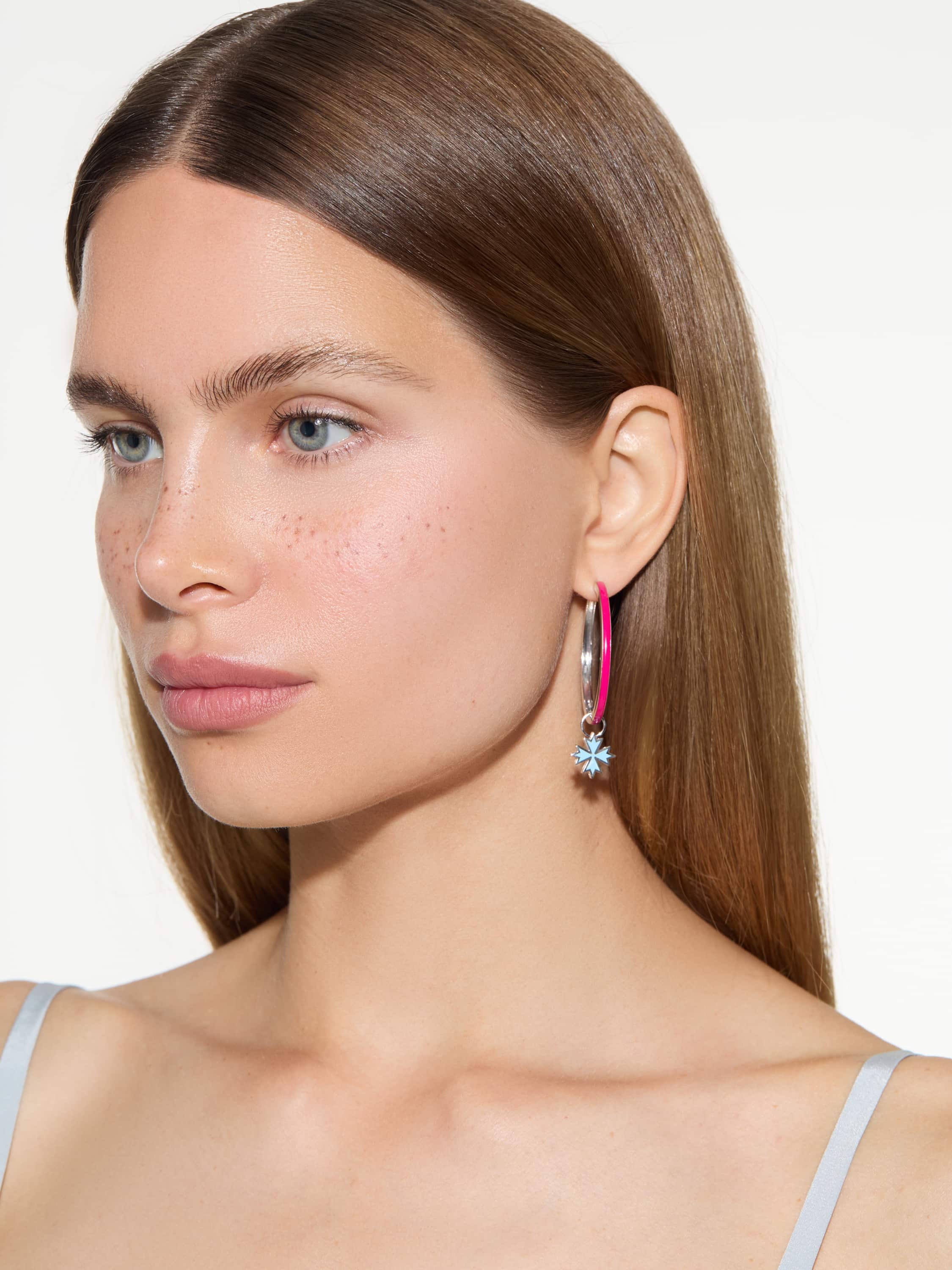 Pendant for hoops in white gold with a cornflower made of light blue enamel.