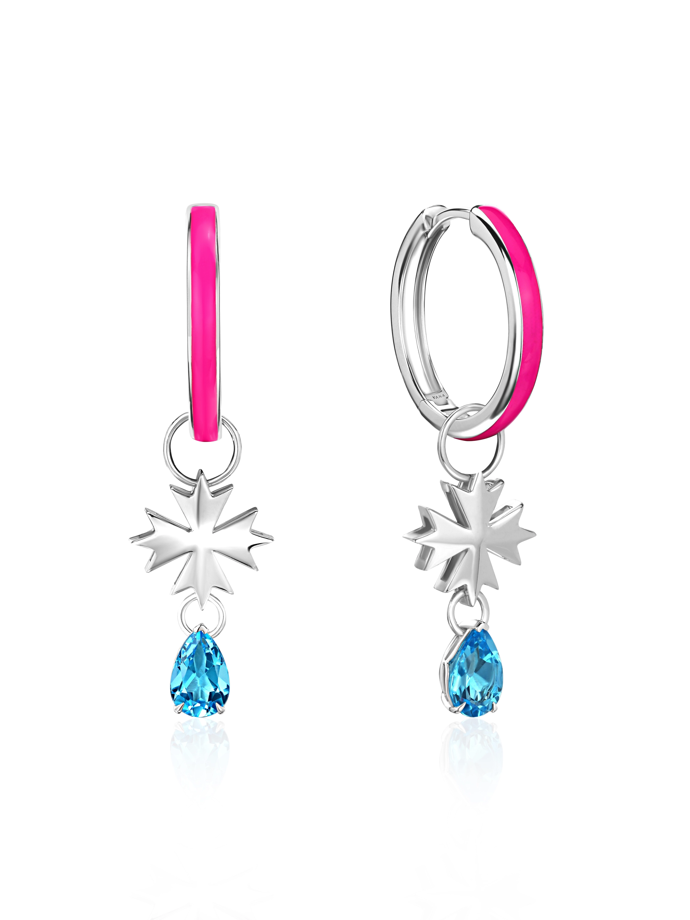 A white gold hoop earring charm with a cornflower and Sky Blue pear-cut topaz weighing 0.98 ct.