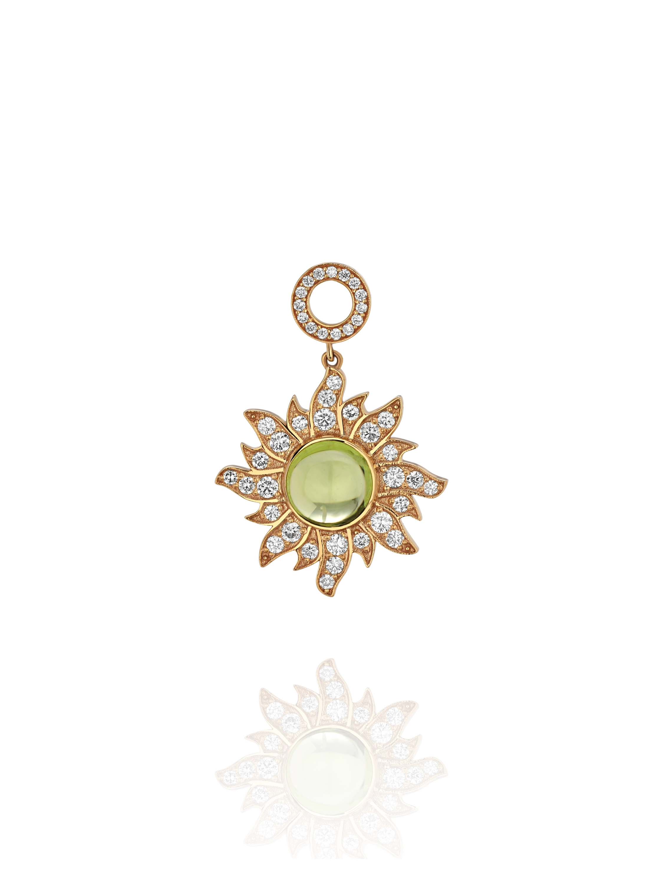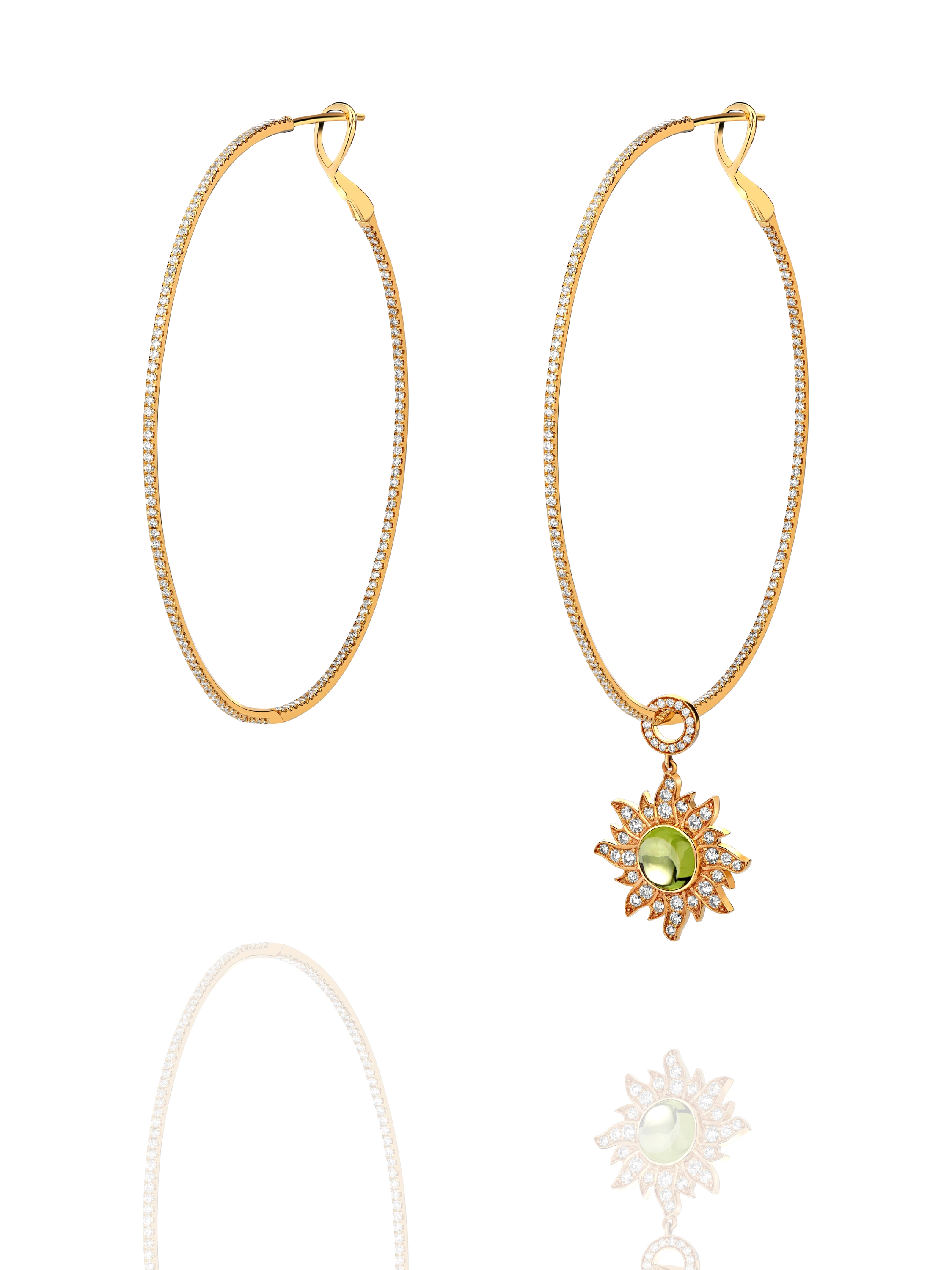 Pendant for hoops in yellow gold with 43 round-cut diamonds with a total weight of 0.47 ct and a 1.62 ct peridot cabochon.