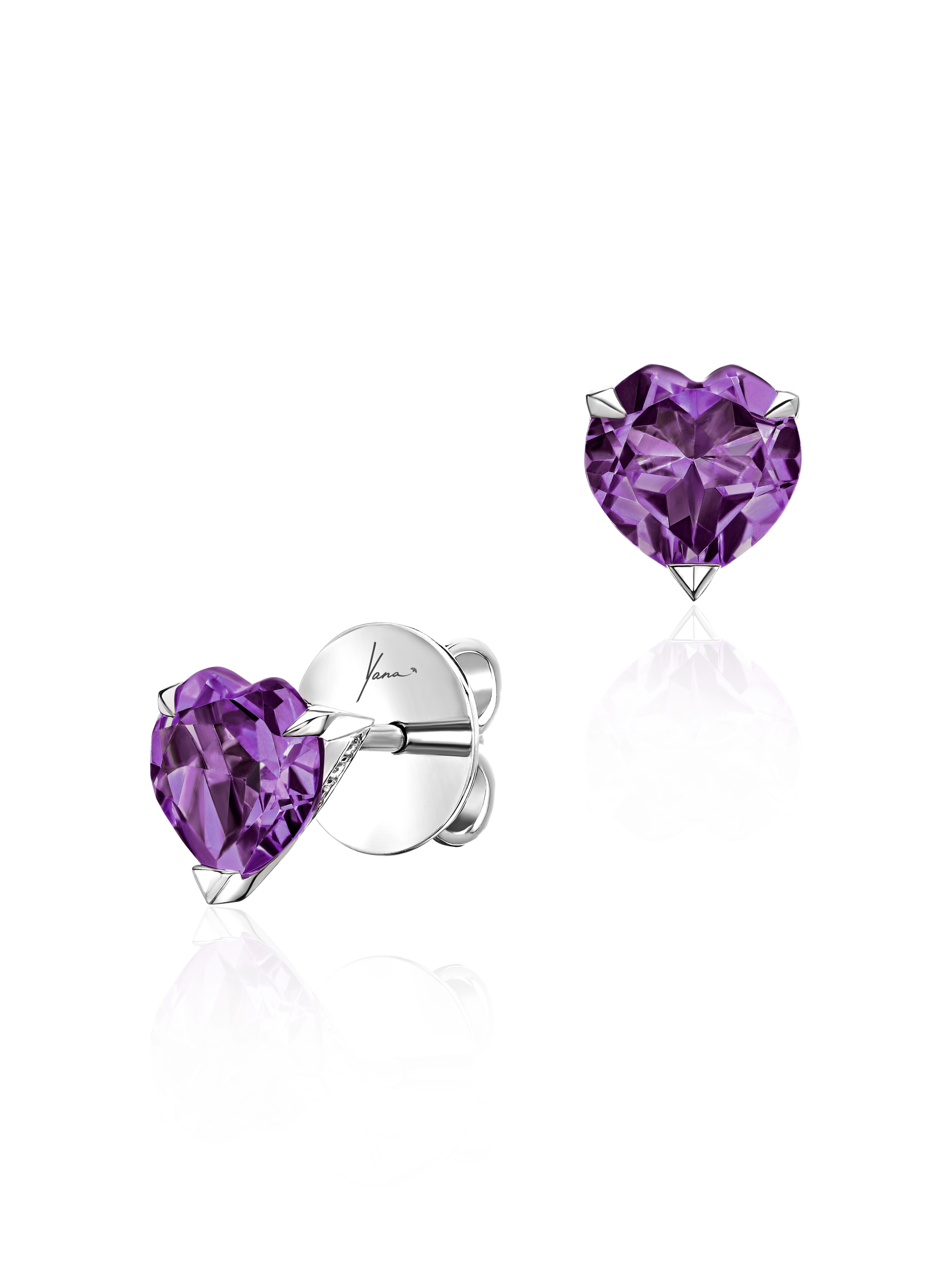 Stud earrings in white gold with 2 heart-cut amethysts with a total weight of 2.64 ct and 26 round-cut diamonds with a total weight of 0.13 ct.