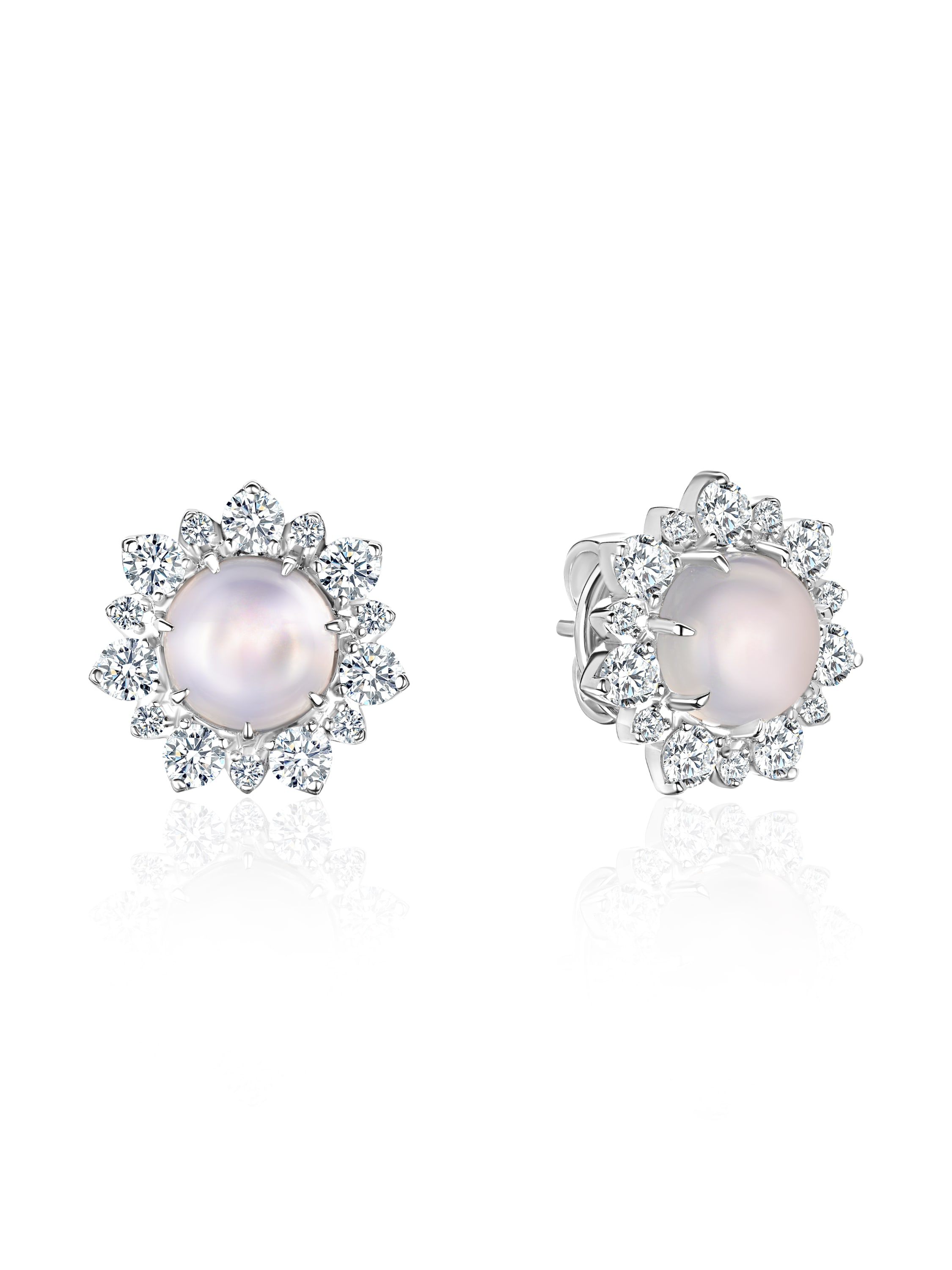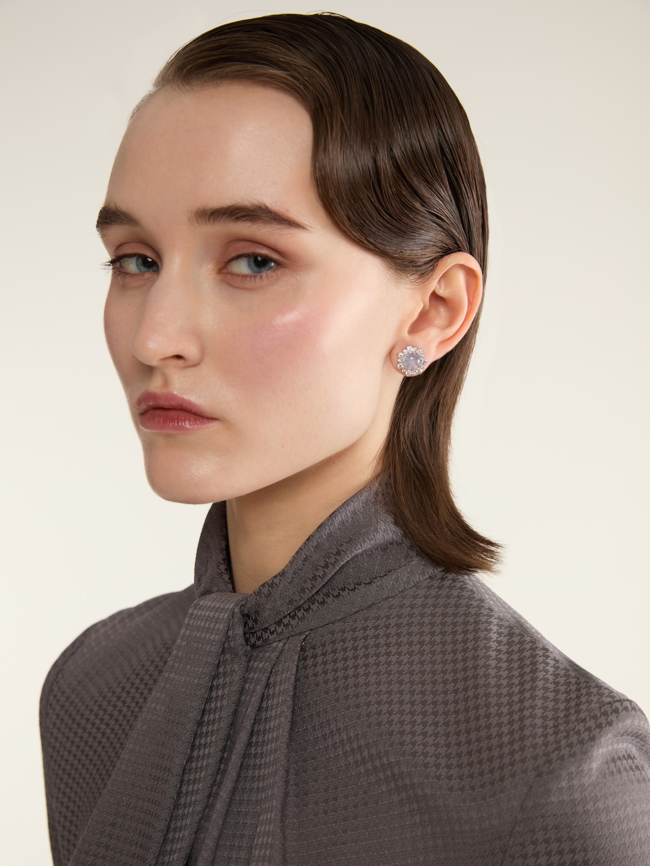 White gold stud earrings with 2 chalcedonies 4.41 ct and 28 round diamonds weighing 1.54 ct.