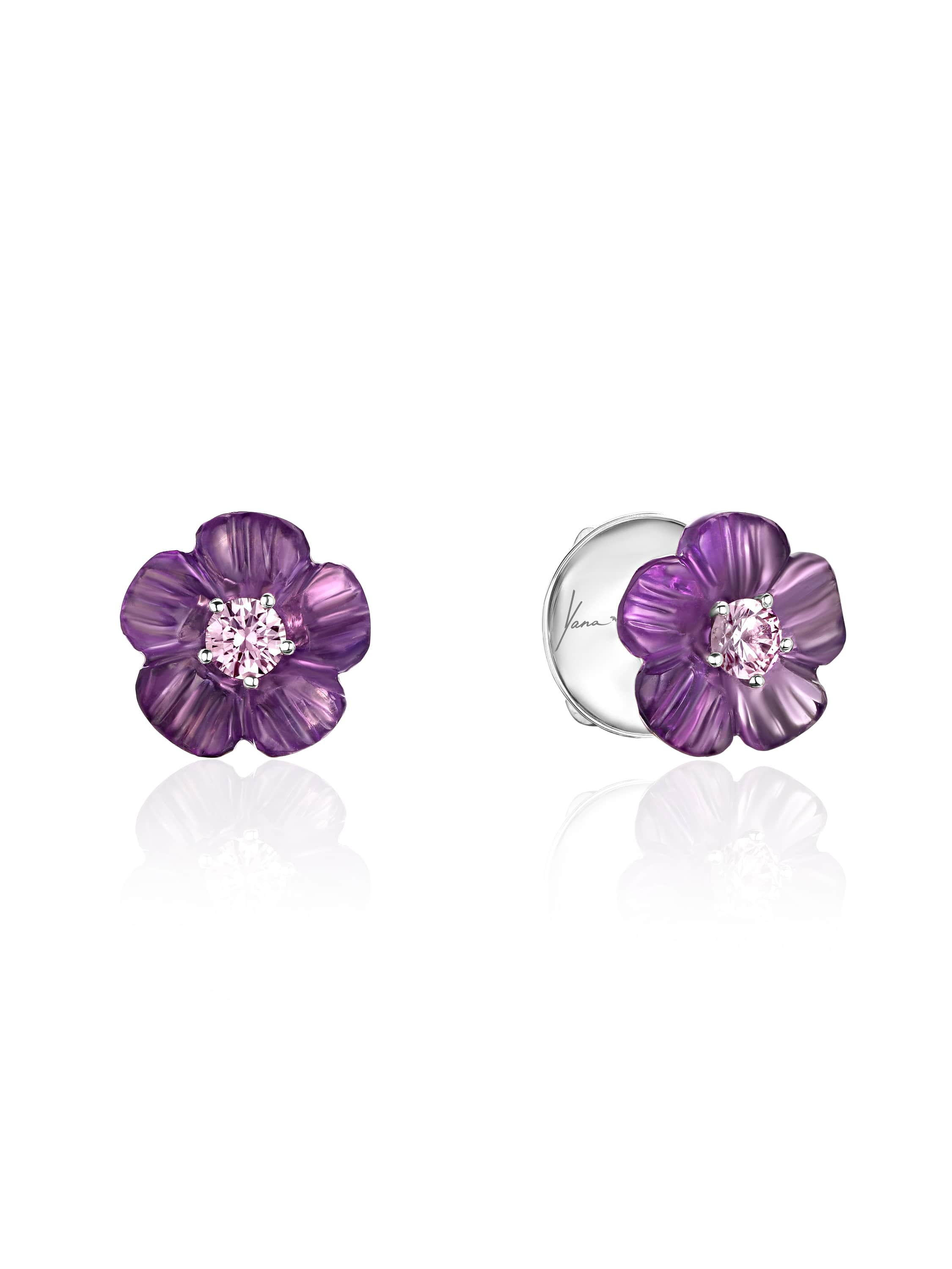 White gold studs with 2 carved amethysts weighing 4.44 ct and 2 pink sapphires weighing 0.32 ct.