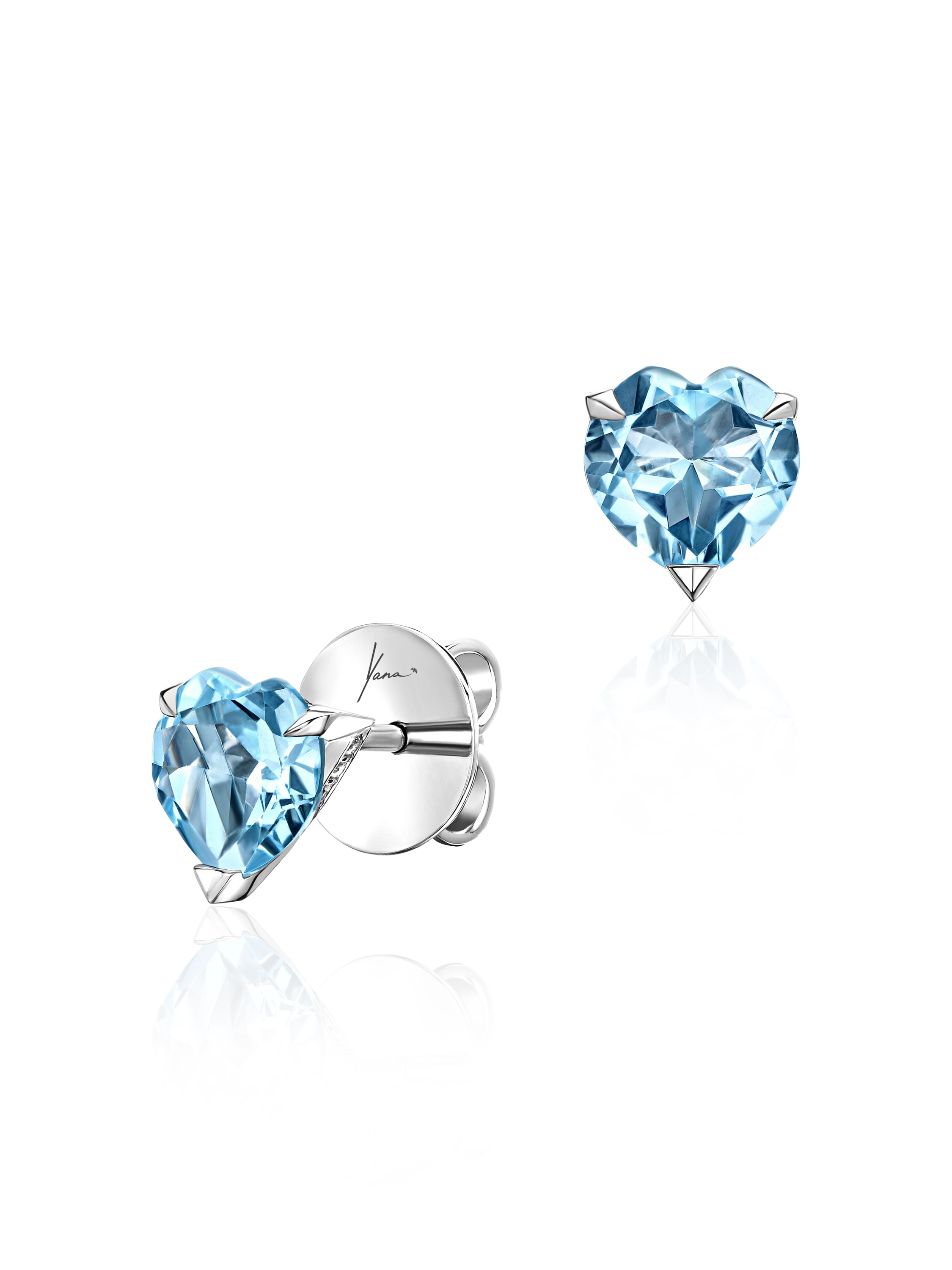 Stud earrings in white gold with 2 Sky Blue topazes in heart cut with a total weight of 4.43 ct and 26 round-cut diamonds with a total weight of 0.12 ct.