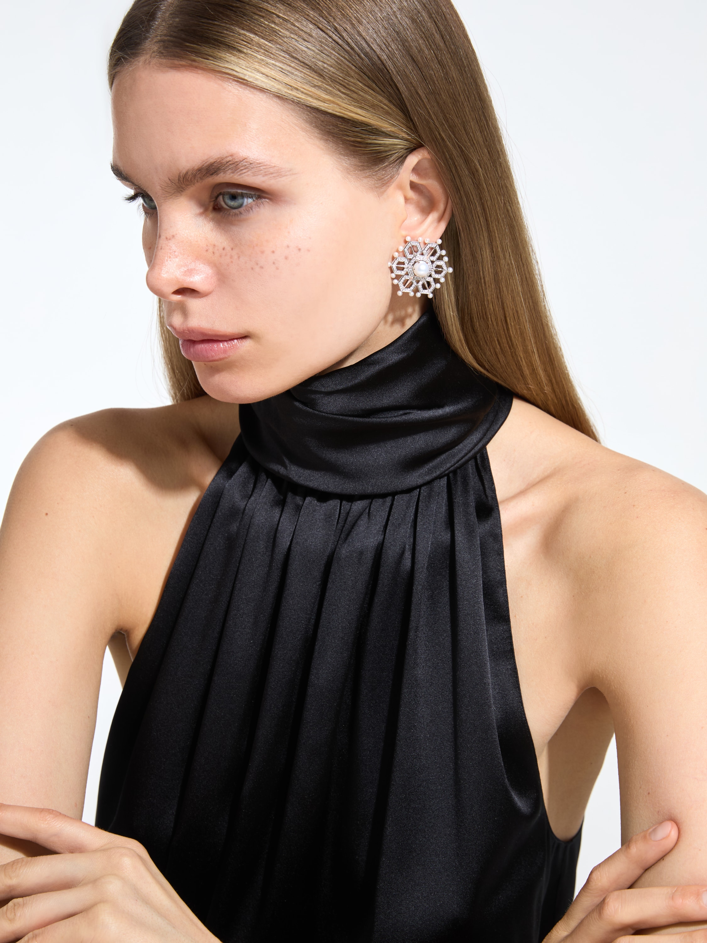 White gold snowflake stud earrings with 36 pearls 0.92 g d 2.5, 2 pearls 1.53 g d 8.0, and 348 round-cut diamonds weighing 2.16 ct.