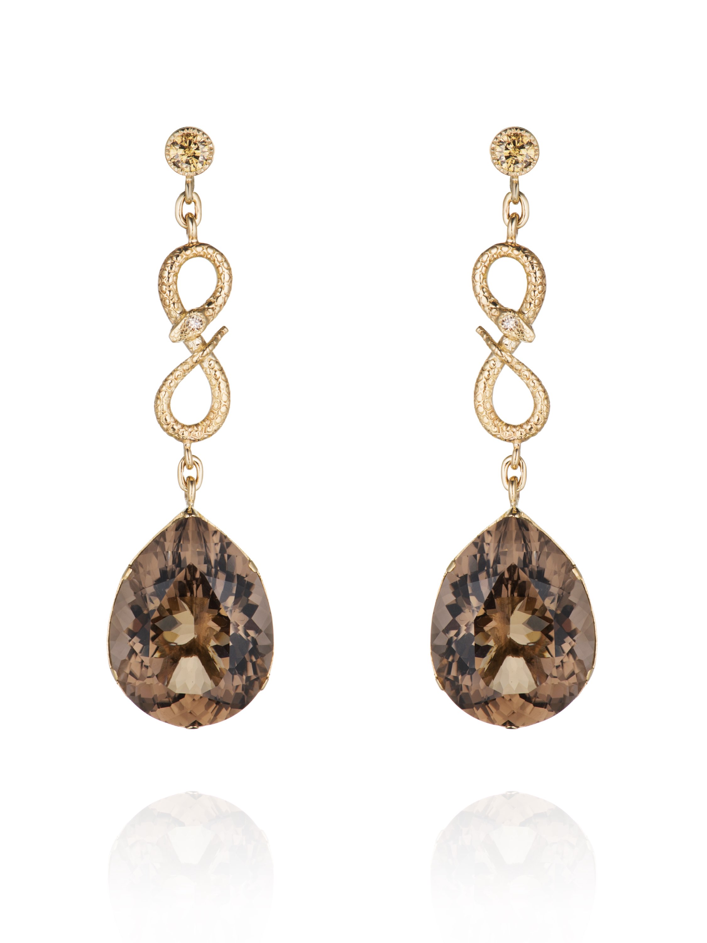 Yellow gold earrings with pear-cut smoky quartz and round diamonds