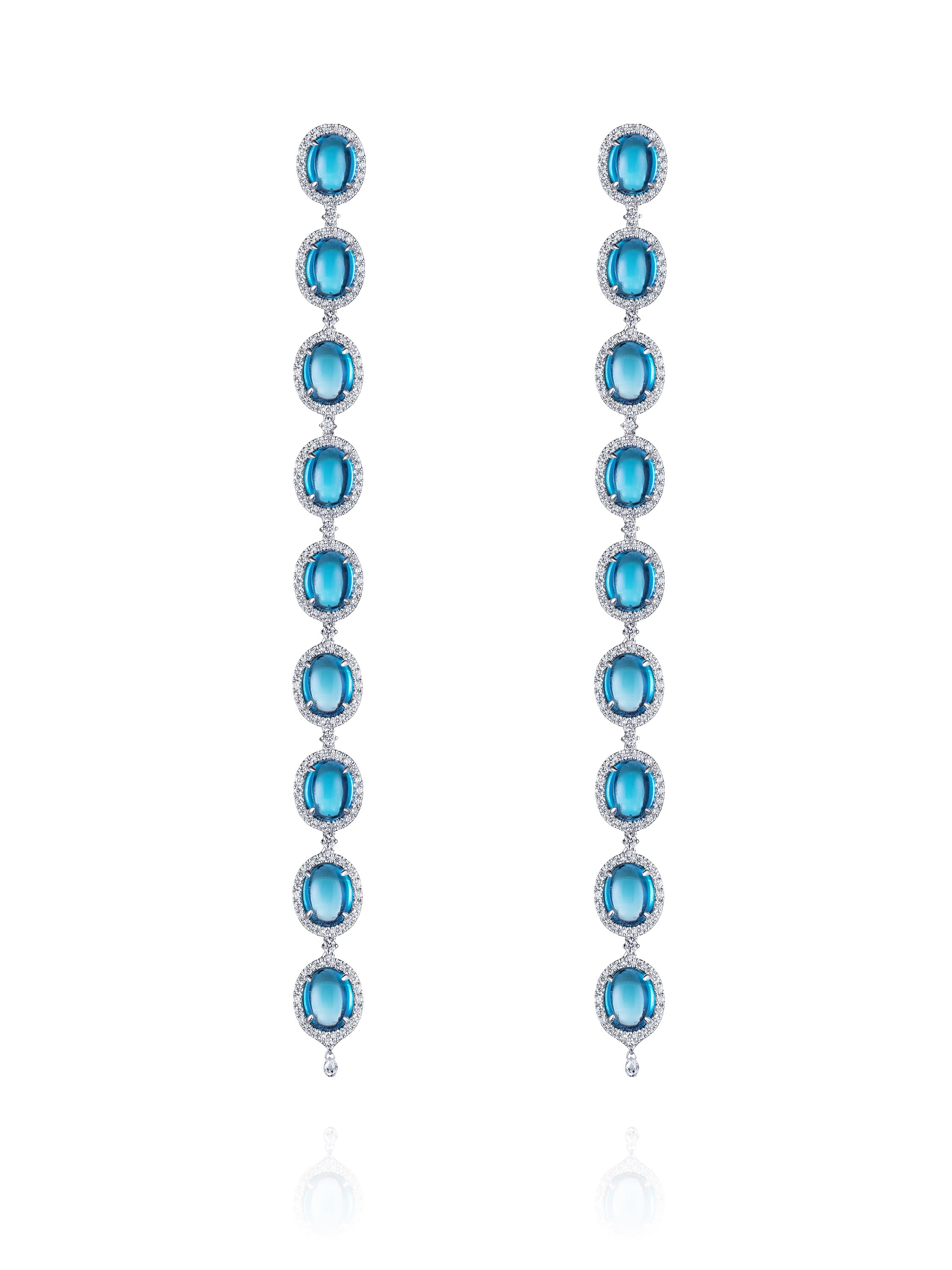 Long white gold earrings with 18 topazes weighing 44.08 ct, 380 round diamonds weighing 3.74 ct and 2 briolette-cut diamonds weighing 0.20 ct. Total diamond weight - 3.94 ct. Length: 13 cm.