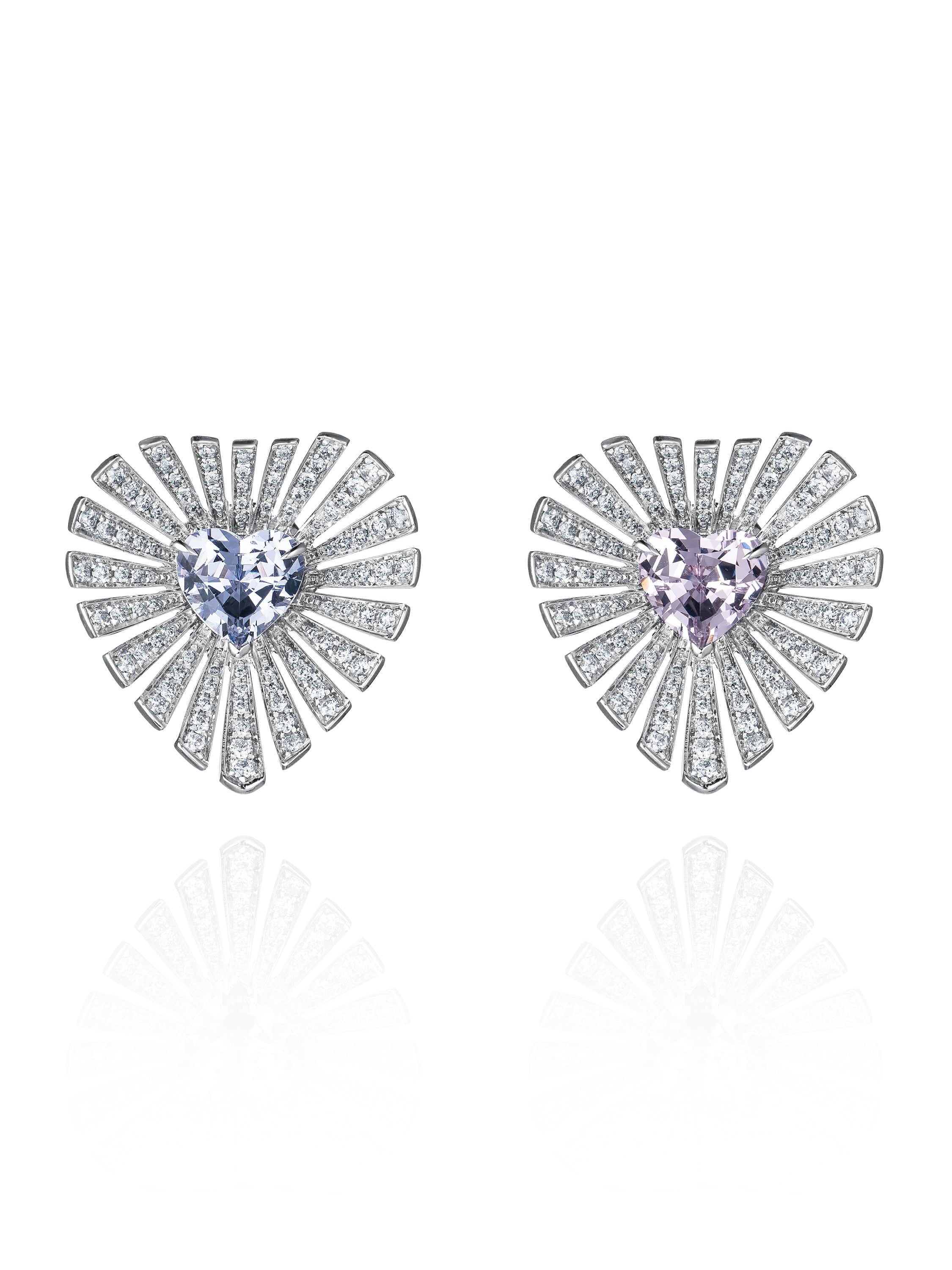 White gold stud earrings set with 2 heart-cut spinel crystals with a total weight of 2.88 ct and 222 round-cut diamonds with a total weight of 1.10 ct.