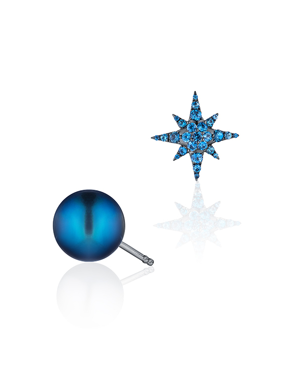 Stud earrings in blackened gold with 1 pearl weighing 1.80 g d 9.5 and 27 round-cut blue sapphires weighing 0.56 ct.