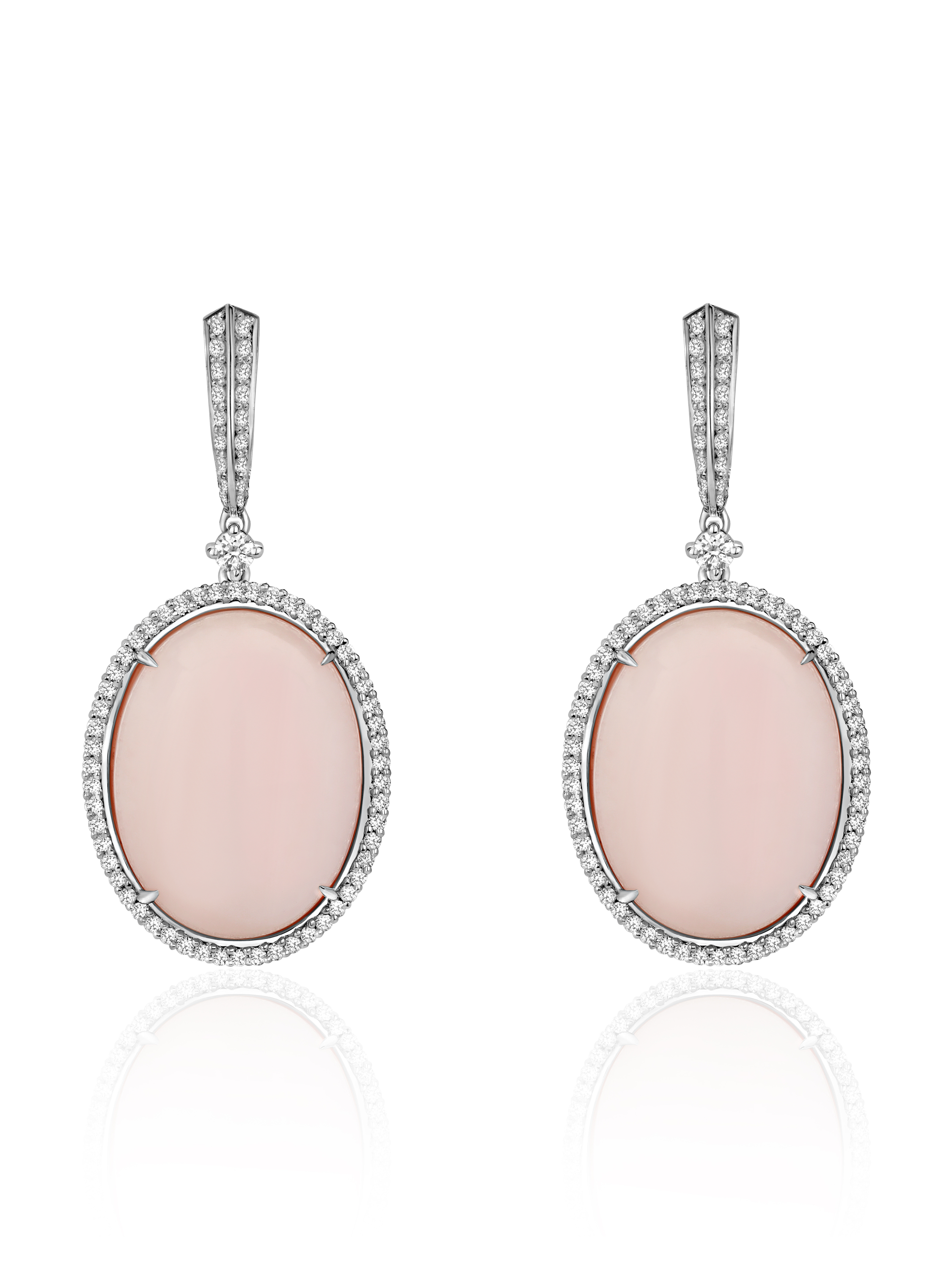 Earrings made of white gold, encrusted with 150 round diamonds with a total weight of 1.66 ct and 2 pink opals in cabochon cut with a total weight of 5.54 g. Item length 4 cm.