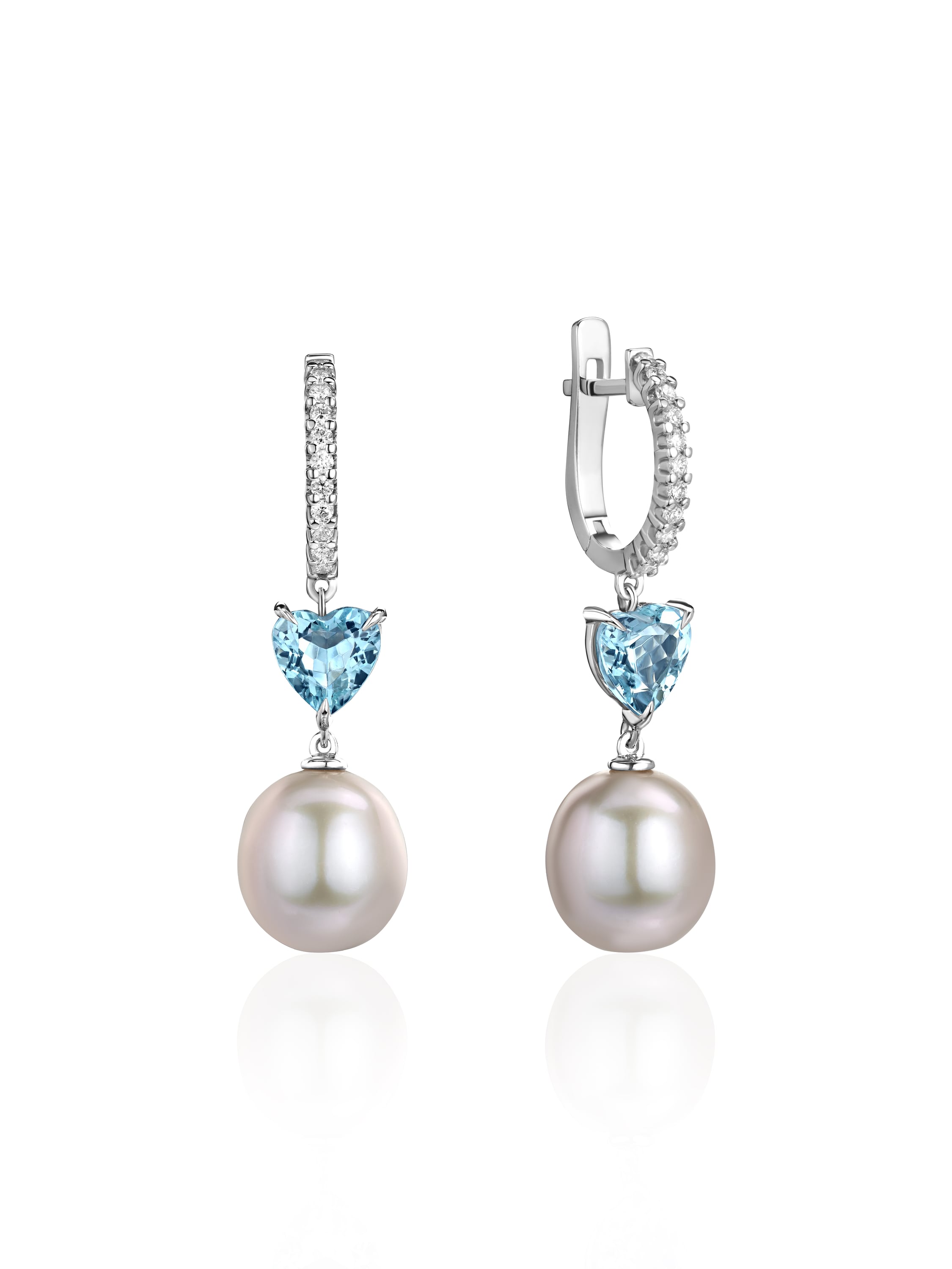 White gold earrings with 2 heart-cut aquamarines weighing 1.06 ct, 2 gray pearls weighing 2.05 g and 22 round diamonds weighing 0.13 ct.