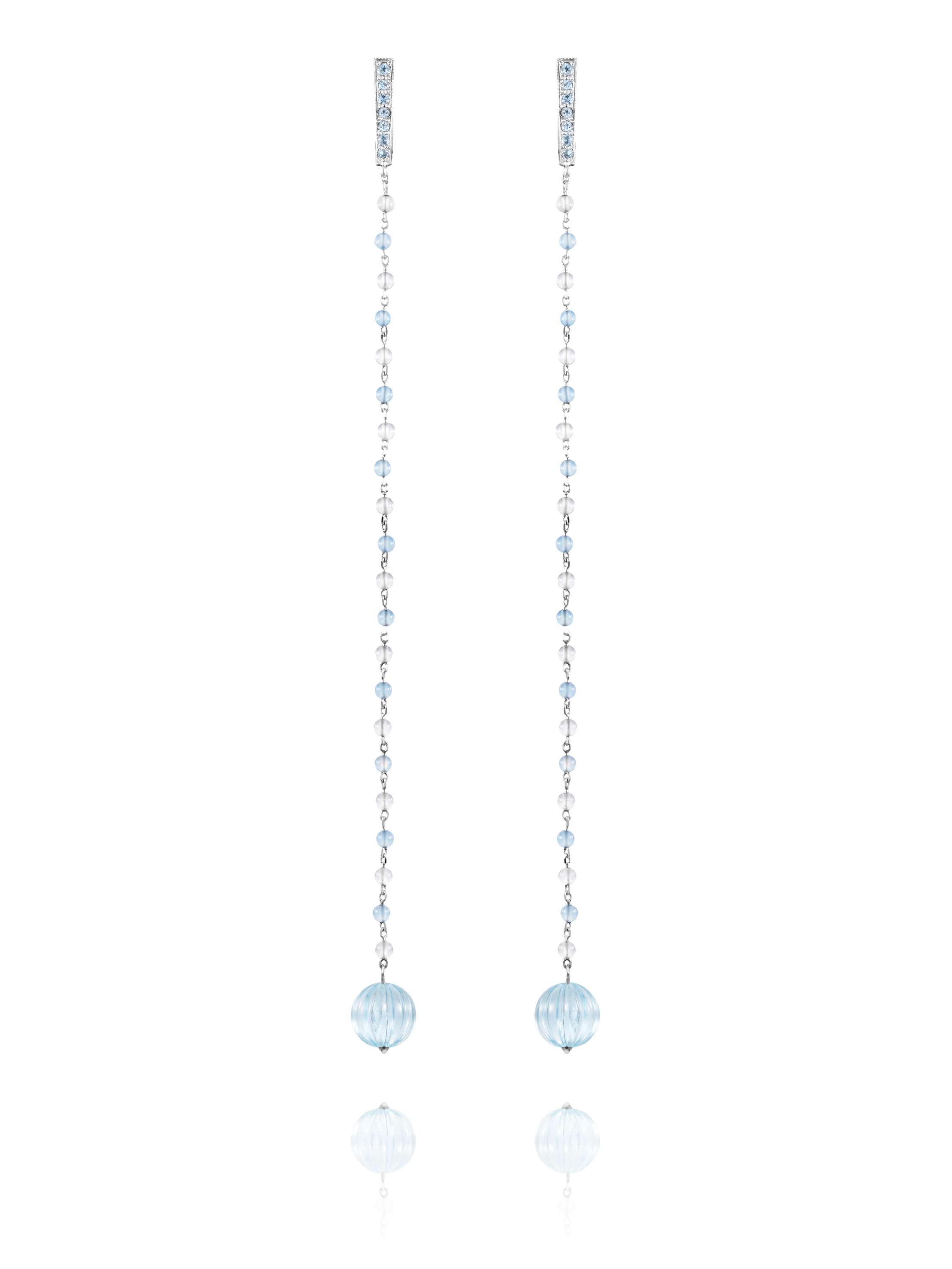 White gold earrings with 14 round colorless topazes weighing 0.30 ct, 16 rock crystal beads weighing 1.32 ct and 16 agate beads weighing 1.08 ct. Length: 11 cm.