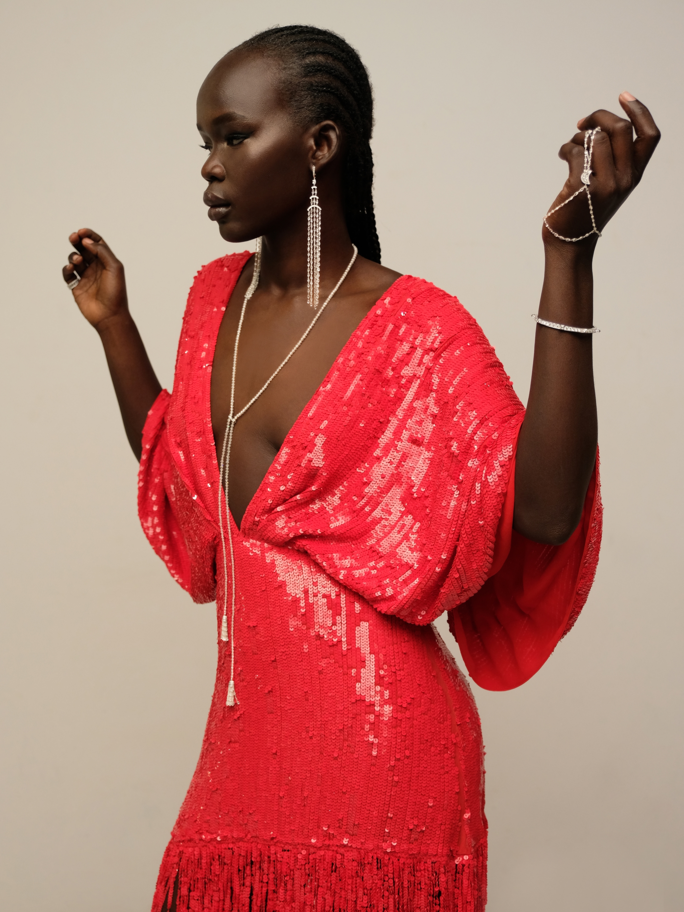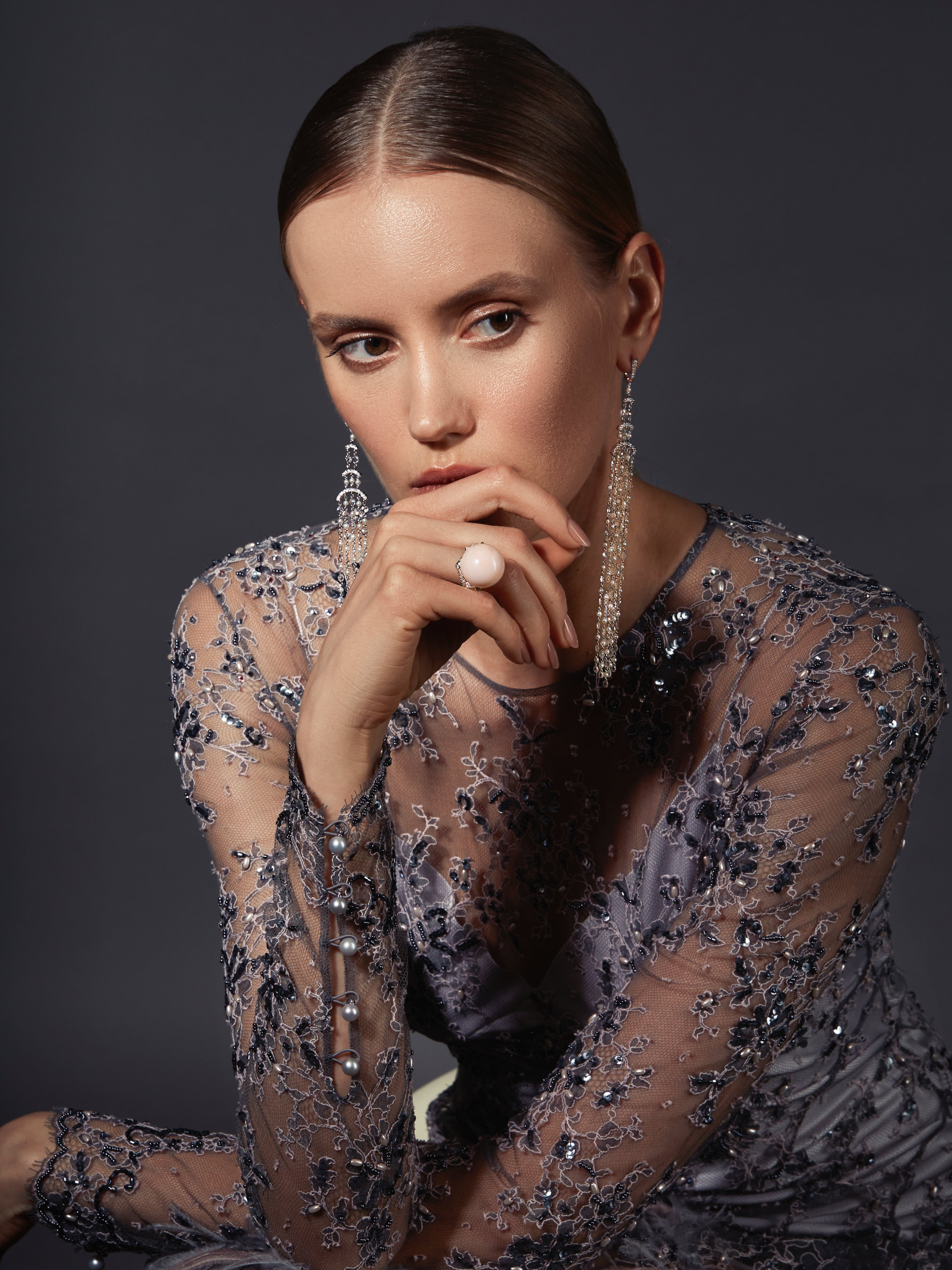 Earrings made of white gold, set with 198 briolettes with a total weight of 26.32 ct, 104 round diamonds with a total weight of 1.27 ct, and 2 rose-cut diamonds of 0.18 ct. Length of the piece: 14 cm.