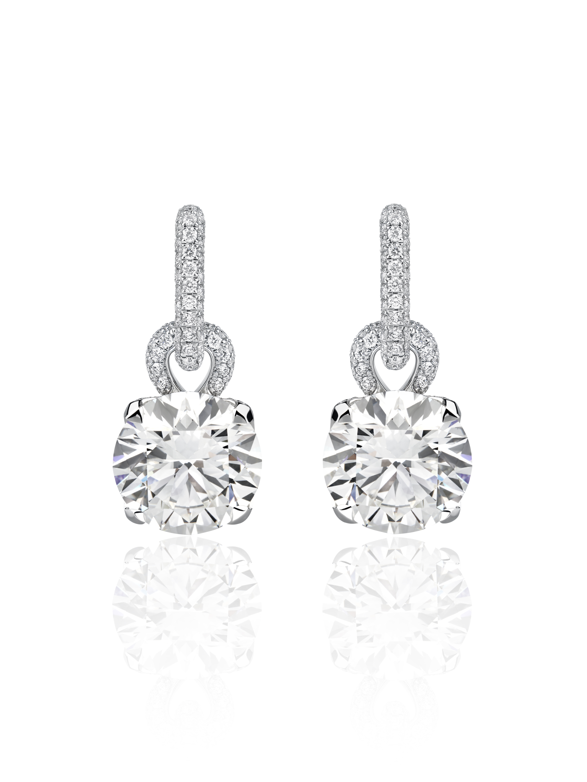 18K white gold earrings with 1 round LG diamond 15.72 ct F/VS2, 1 round LG diamond 15.76 ct F/VS2, and 198 round LG diamonds 2.40 ct. Item length: 3 cm.