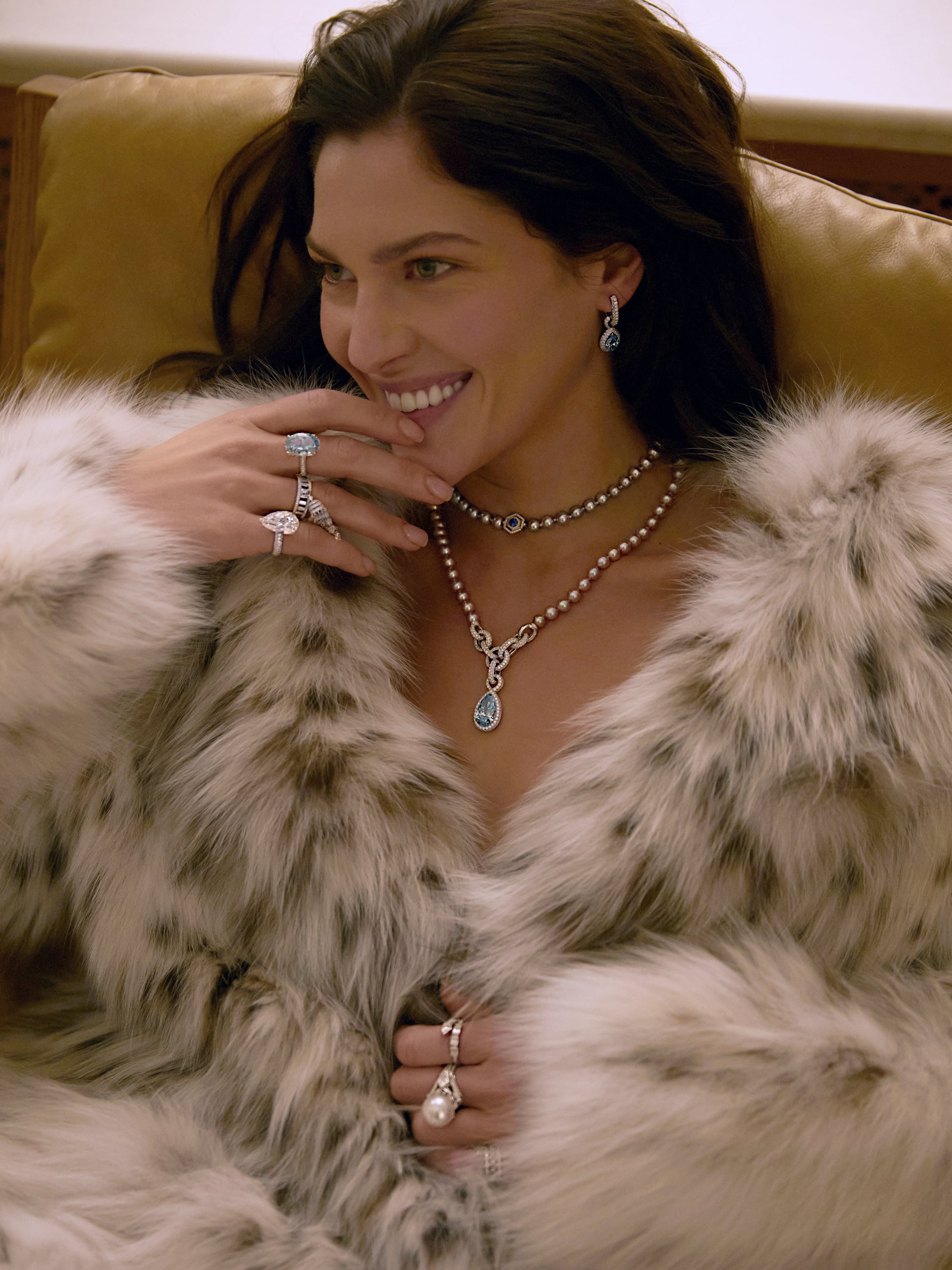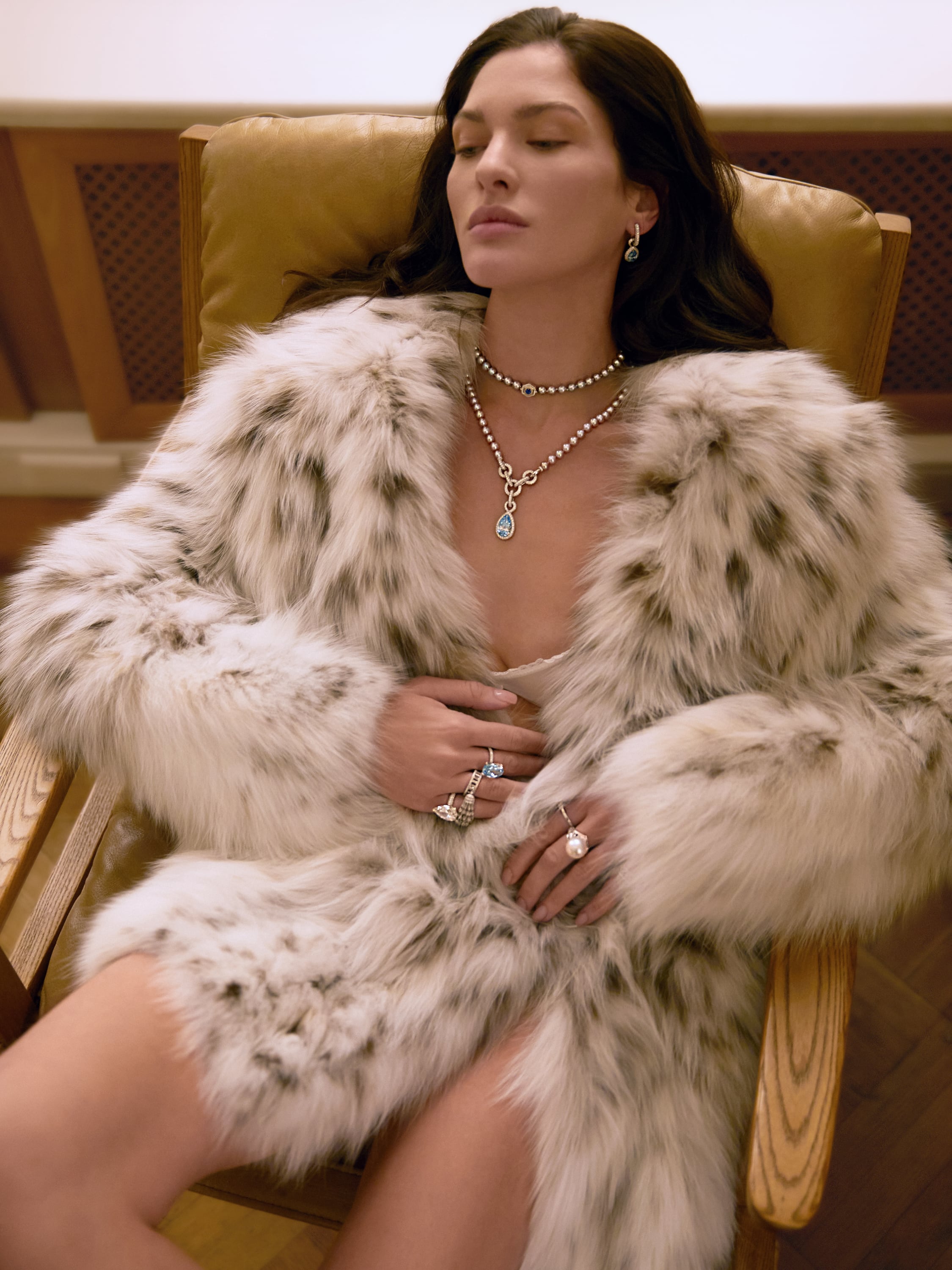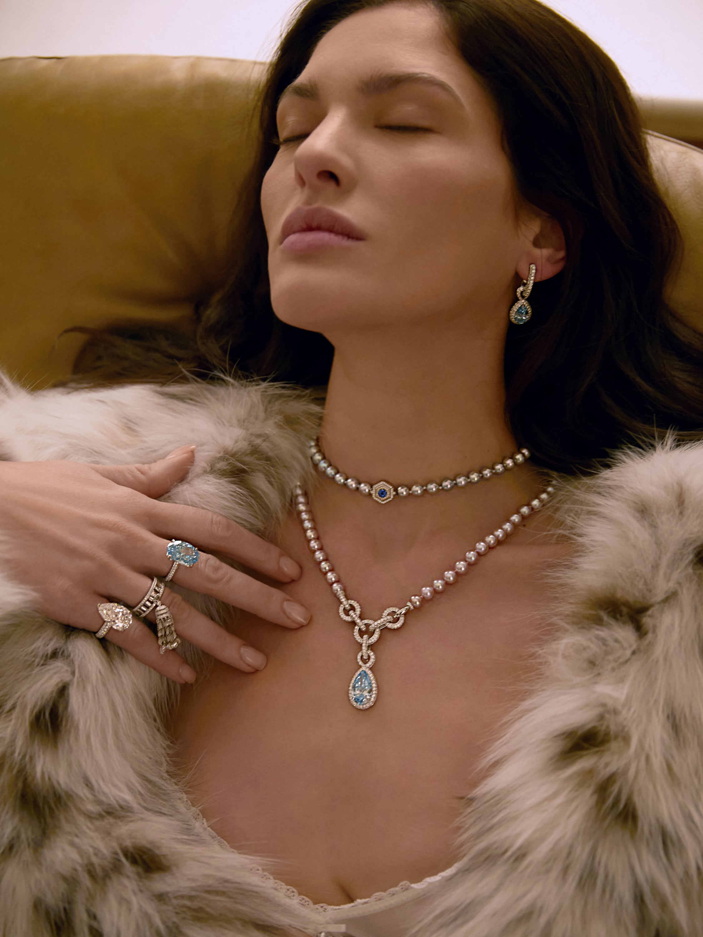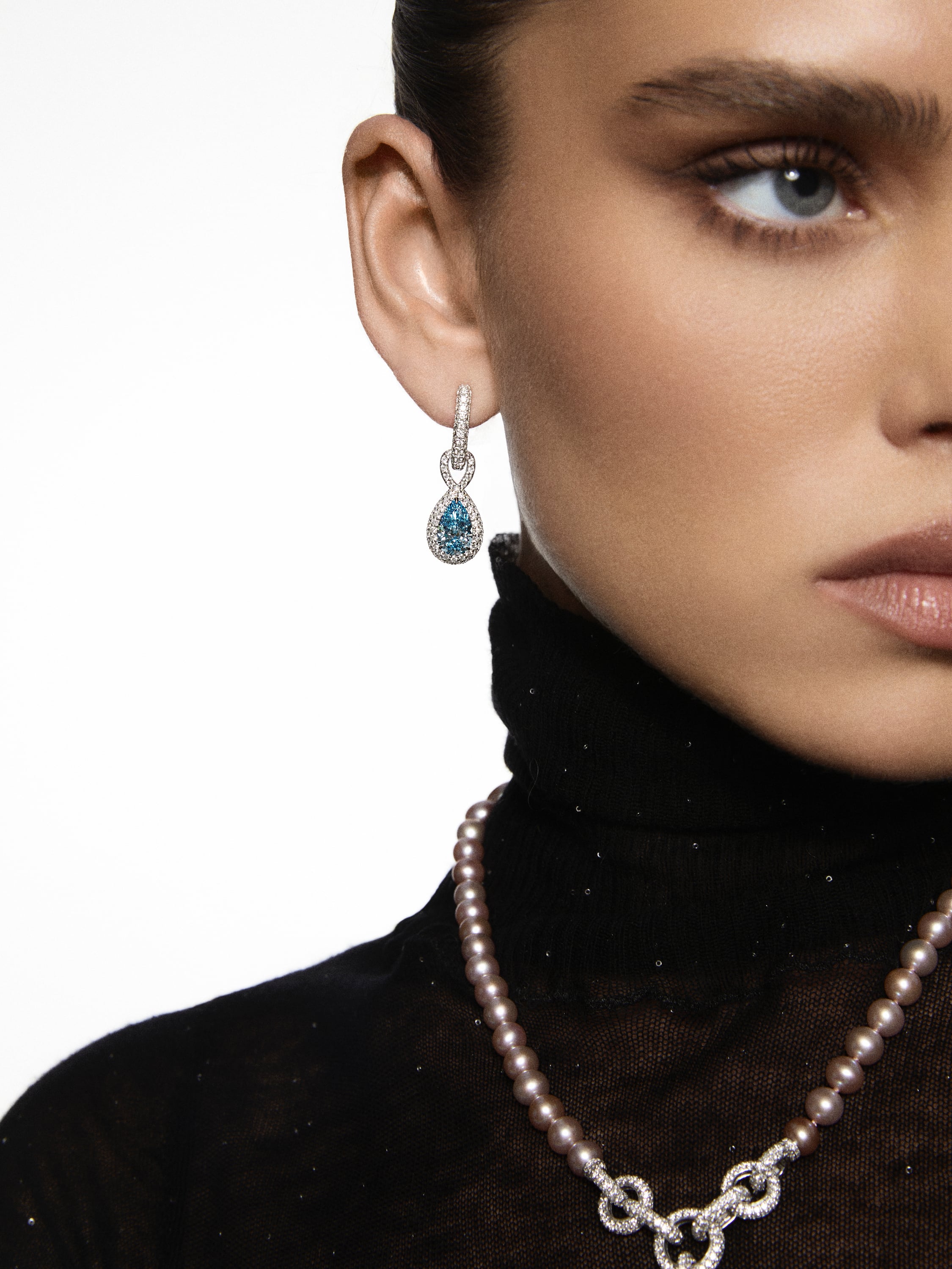 White gold earrings with 1 blue lab-grown diamond 2.52 ct VS1, 1 blue pear-cut lab-grown diamond 2.52 ct VVS2 and 178 round diamonds weighing 2.44 ct. Item length: 3.5 cm.
