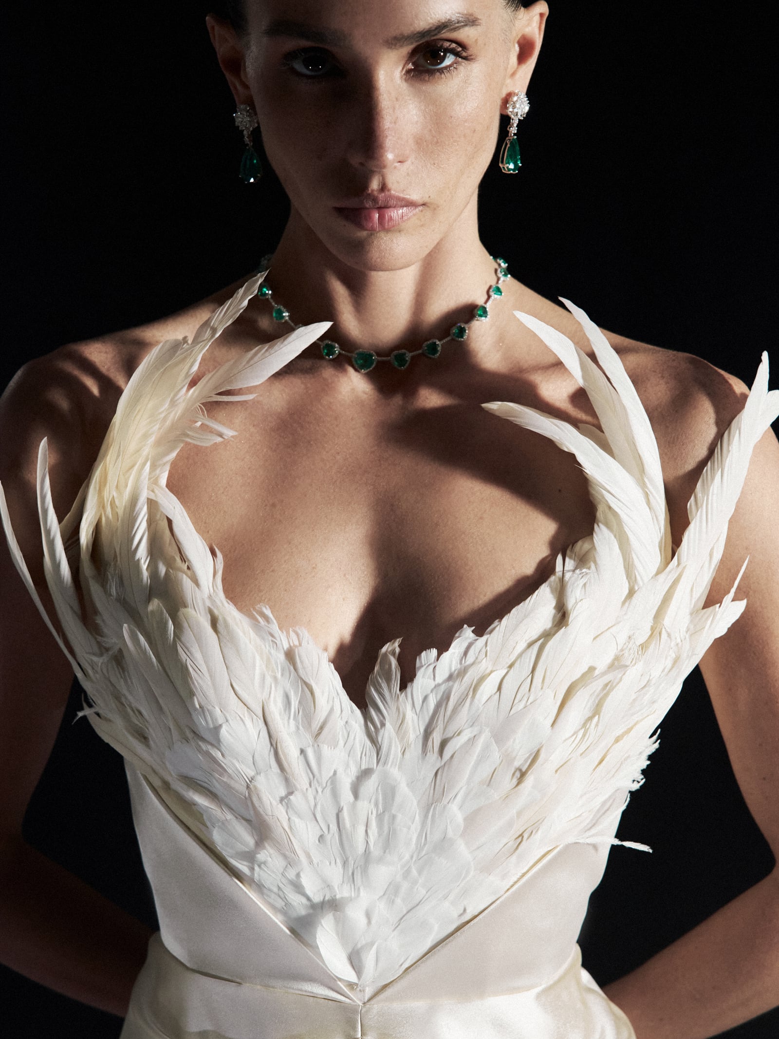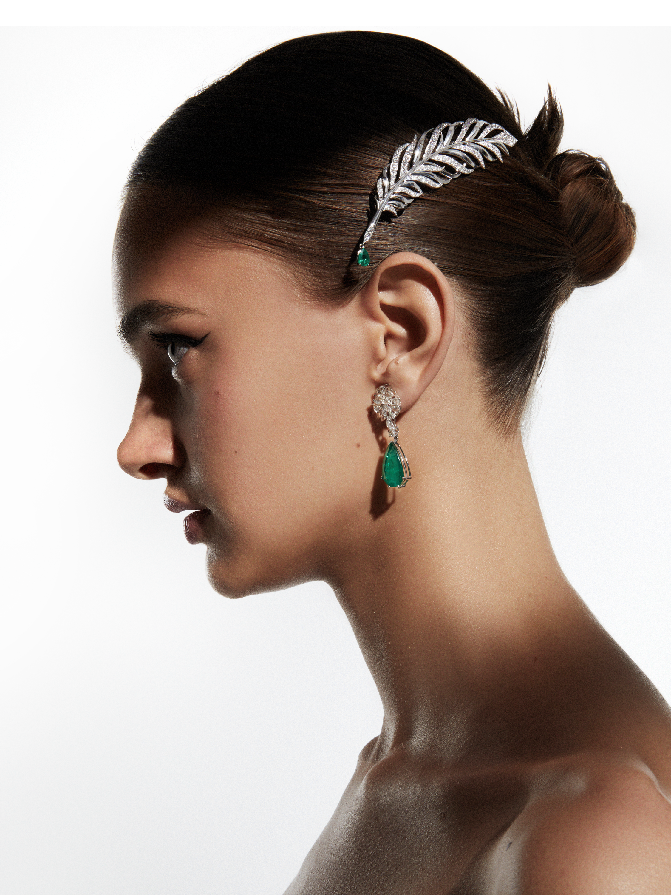 White gold earrings with 2 pear-cut emeralds, 22 pear-cut diamonds, 4 round-cut diamonds with a total weight of 0.22 ct and 10 marquise-cut diamonds with a total weight of 0.9 ct. Item length: 4 cm.