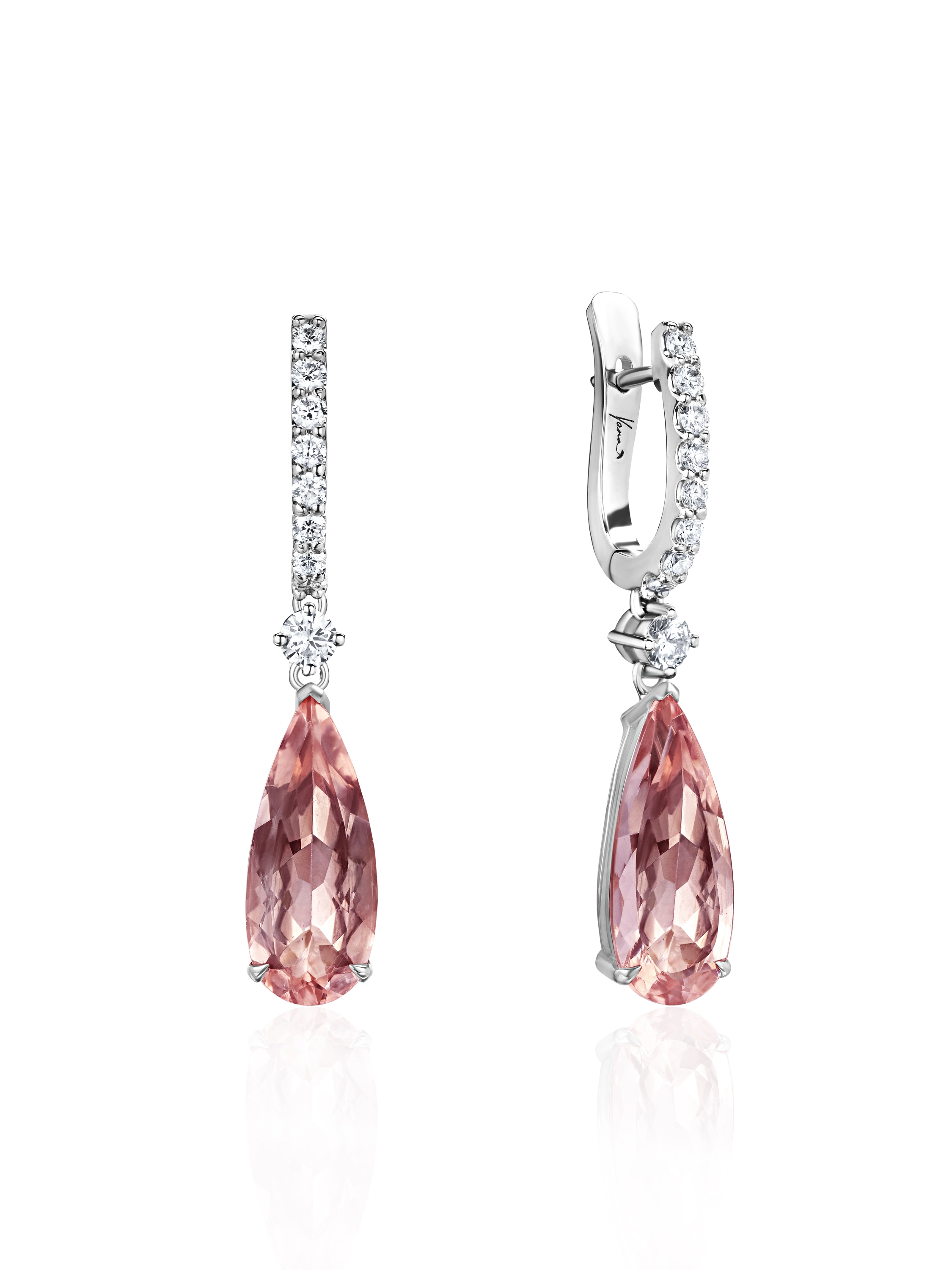 White gold earrings with 2 pear-cut morganites with a total weight of 5.36 ct and 20 round-cut diamonds with a total weight of 0.63 ct. Item length: 3 cm.