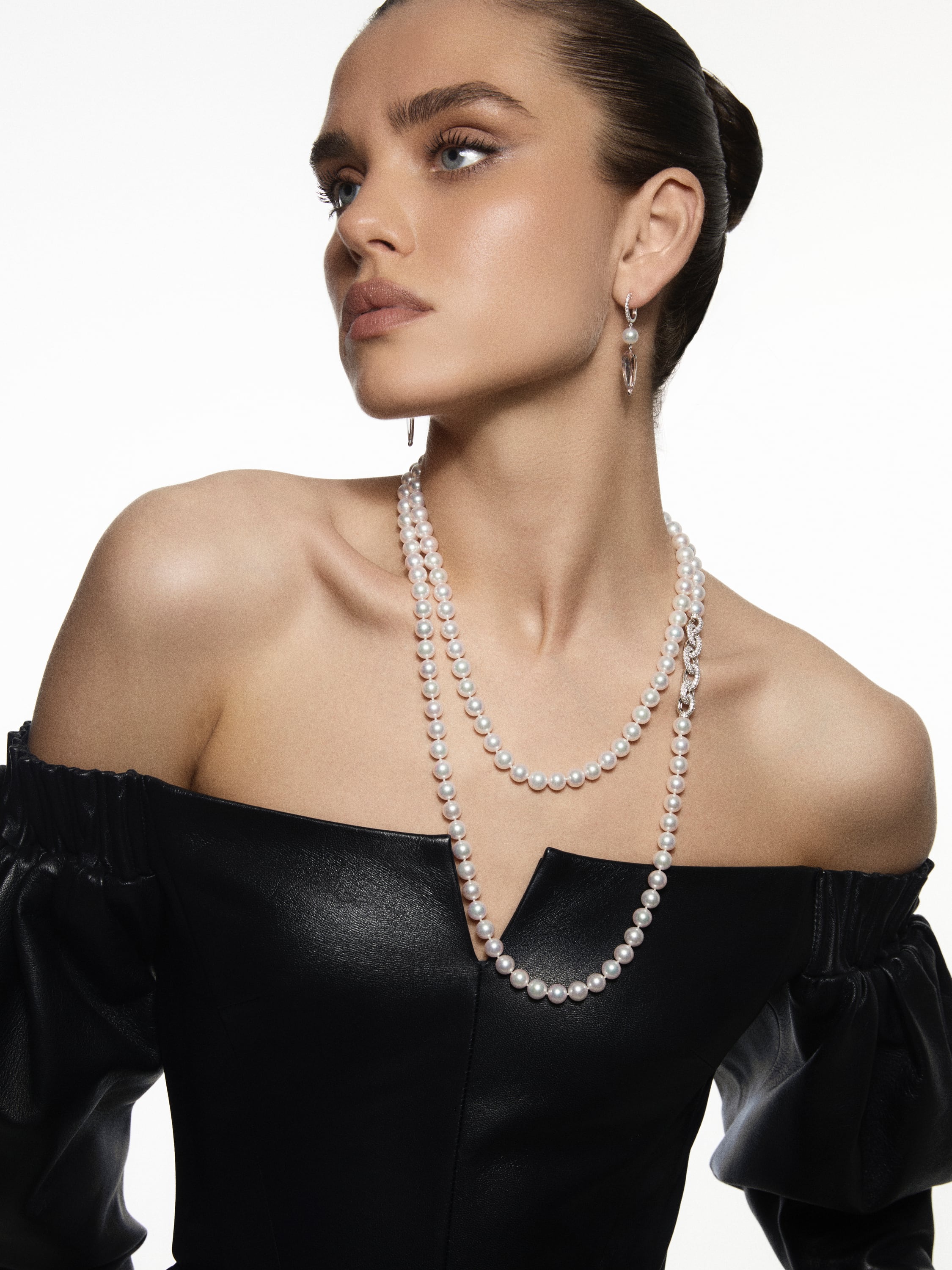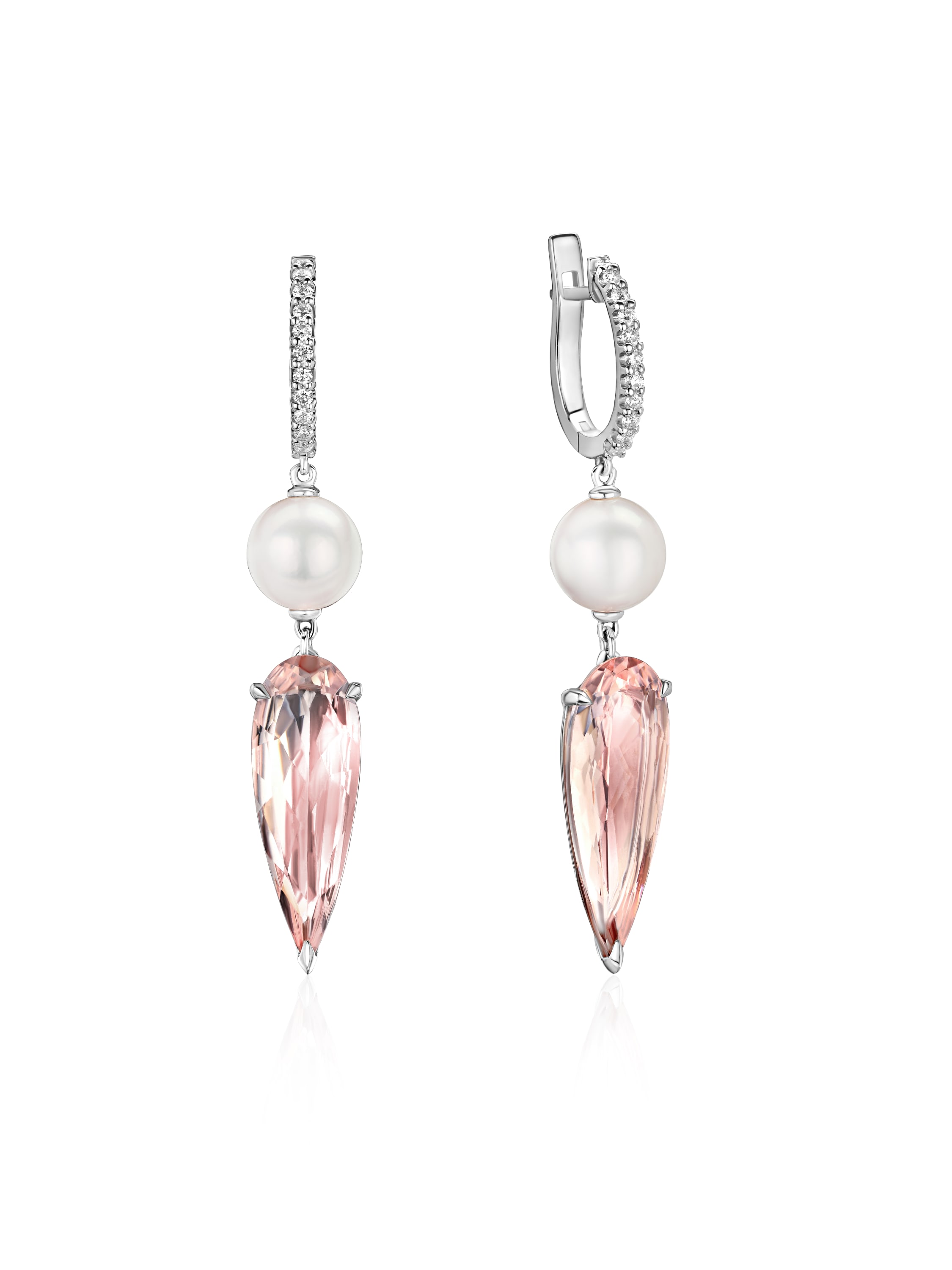 White gold earrings with 2 pear-cut morganites weighing 5.34 ct, 2 Akoya pearl beads 1.07 g d 7.0 mm and 22 round-cut diamonds 0.16 ct. Product length: 4.5 cm.