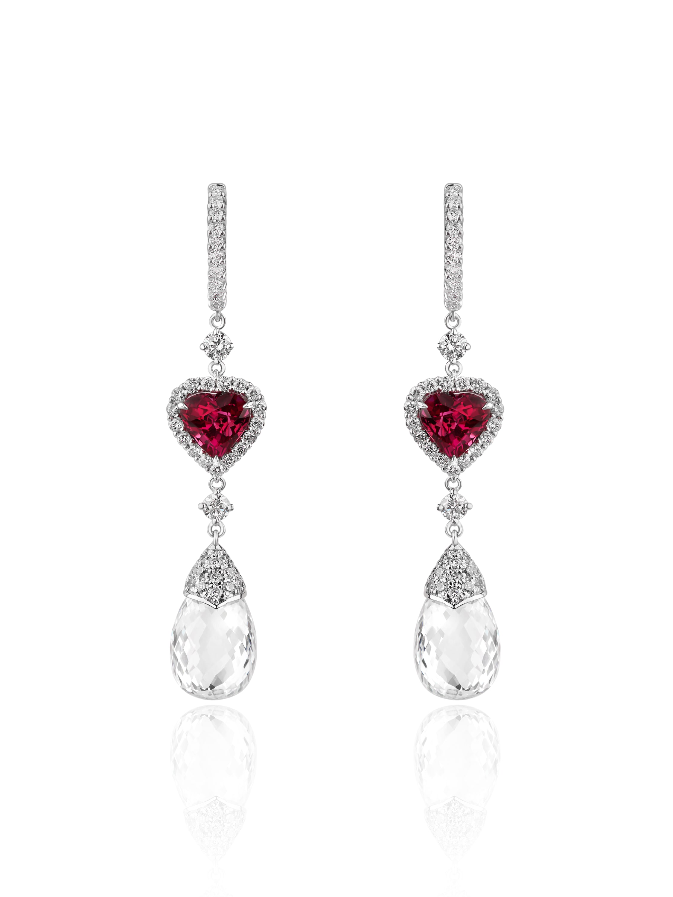 White gold earrings with 1 heart-cut ruby weighing 0.98 ct, 1 heart-cut ruby weighing 0.98 ct, 1 briolette-cut diamond weighing 4.66 ct, 1 briolette-cut diamond weighing 4.93 ct, 160 round diamonds weighing 1.34 ct. Length: 4.5 cm.