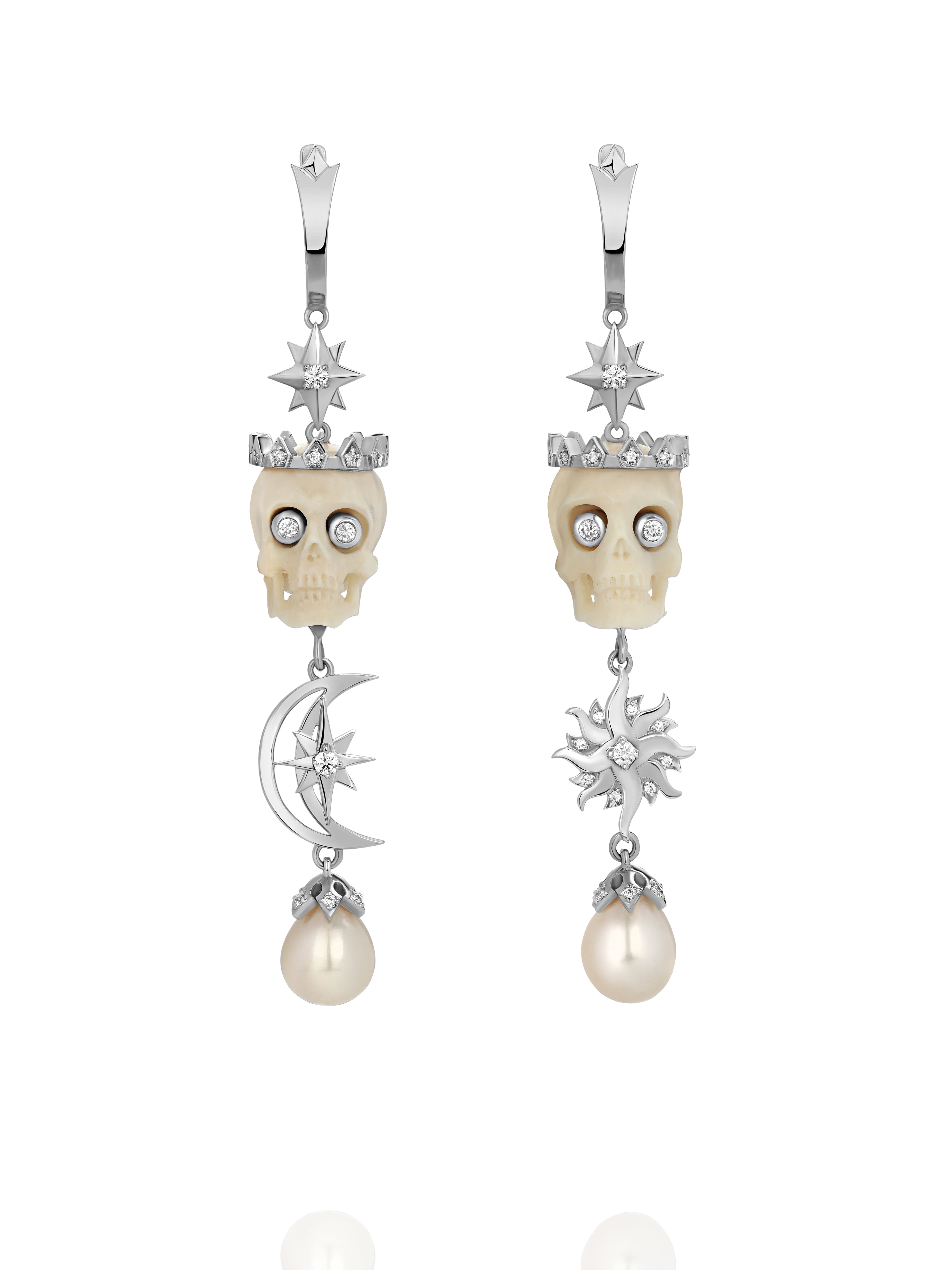 White Gold, Pearls, Diamonds & Mammoth Tusk Skull Earrings