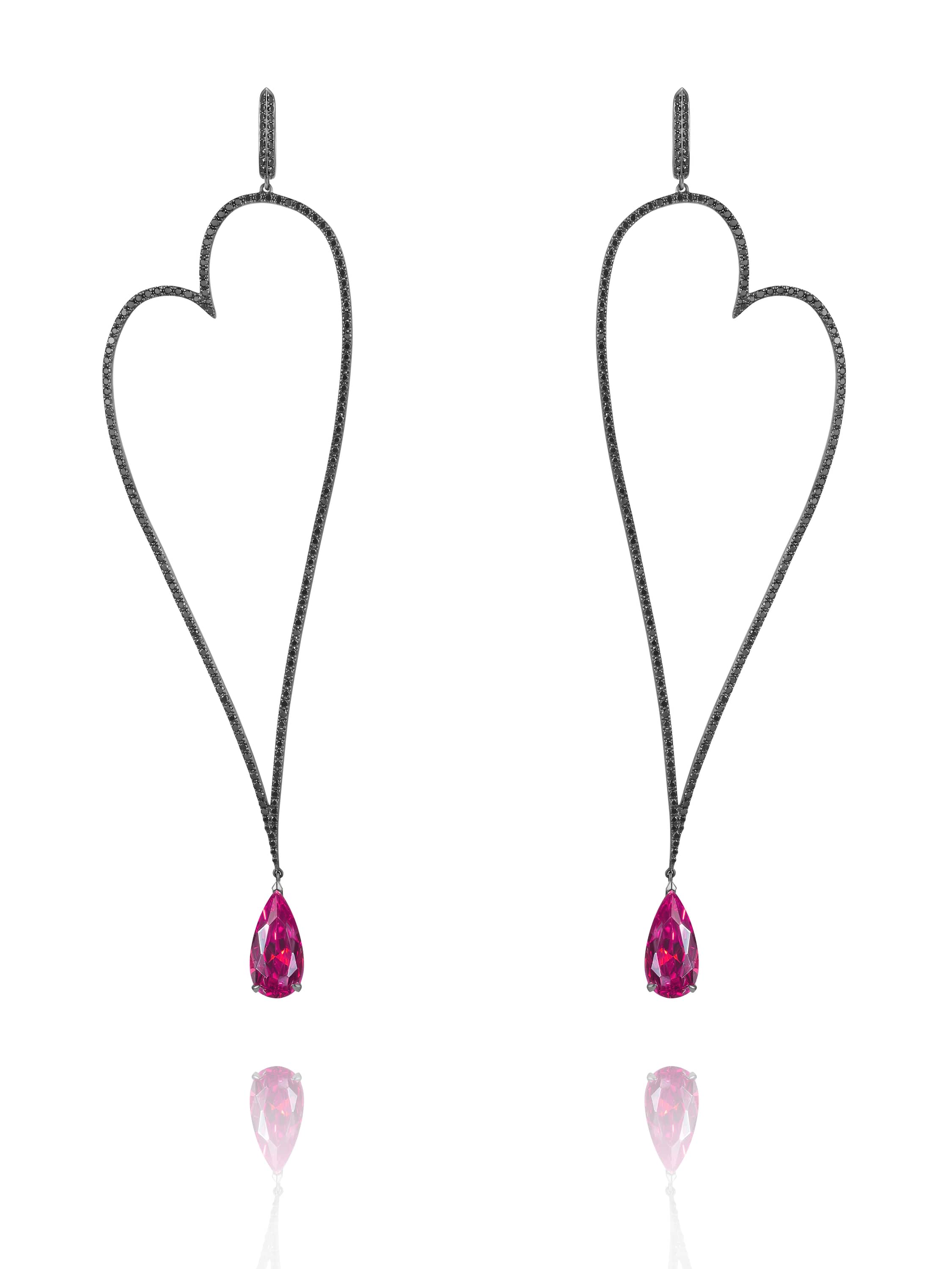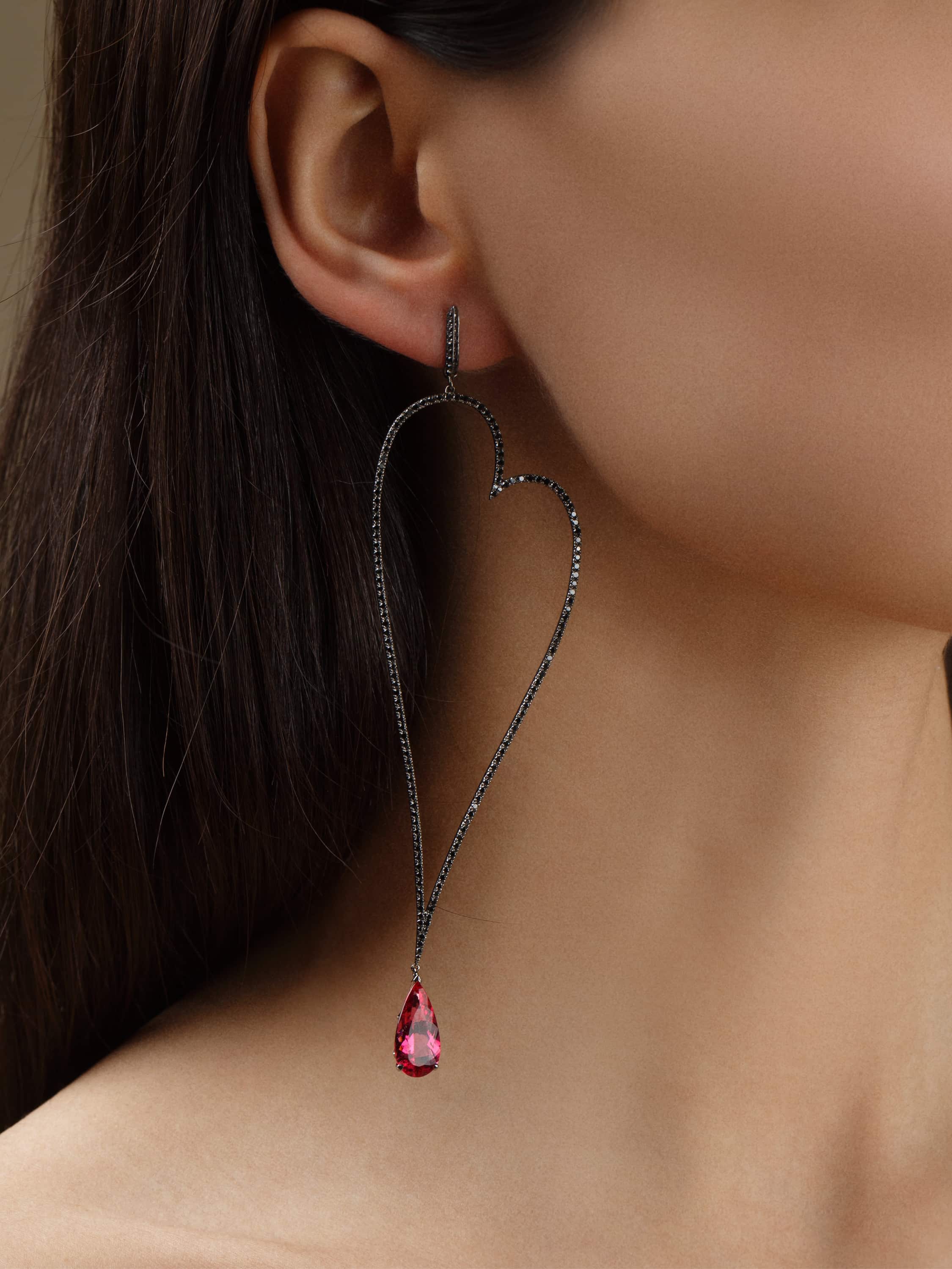 Heart-shaped earrings made of blackened 750 gold and set with 424 black round-cut diamonds with a total weight of 2.47 ct and two pear-cut tourmalines weighing 5.49 ct. Length: 12 cm.