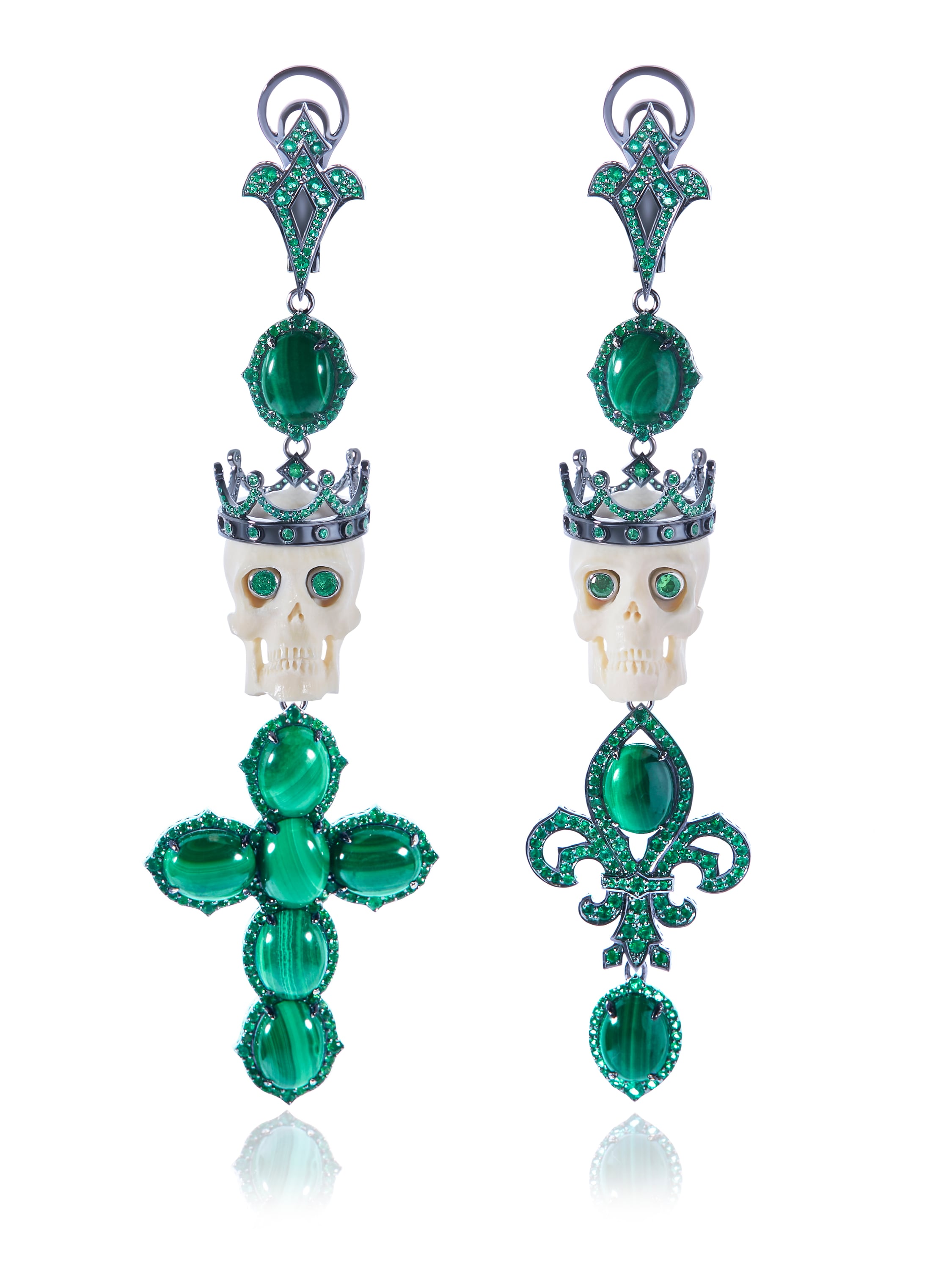 Long asymmetric earrings with skulls carved from mammoth tusk are made of 750 blackened gold and inlaid with 10 oval malachites weighing 22.70 ct and 508 emeralds with a total carat weight of 2.49 ct.