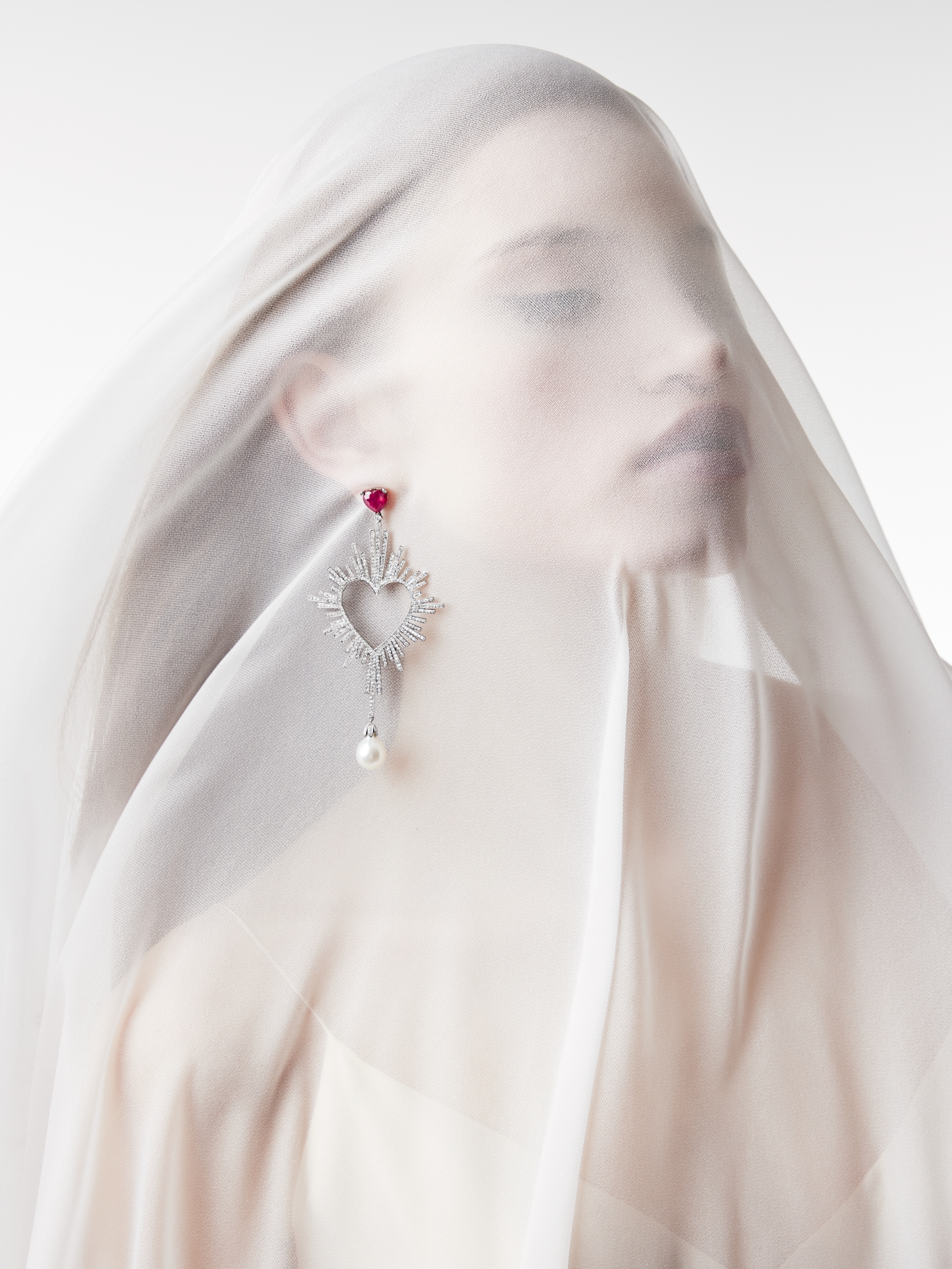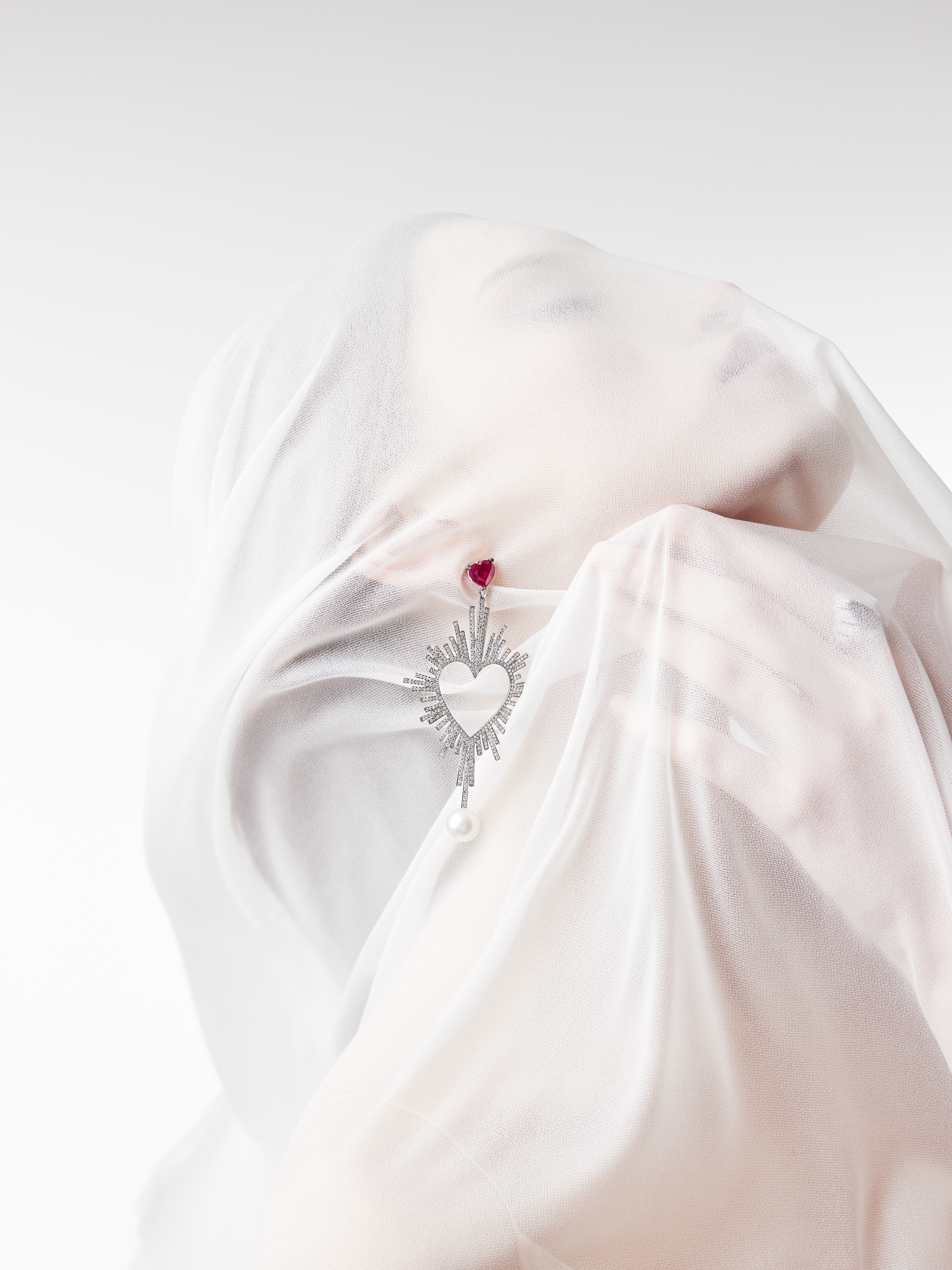 Blackened gold earrings set with 2 heart-cut rubies with a total weight of 7.41 ct, 2 pearls weighing 4.04 g, and 878 round gray diamonds with a total weight of 5.34 ct. Item length: 10 cm.