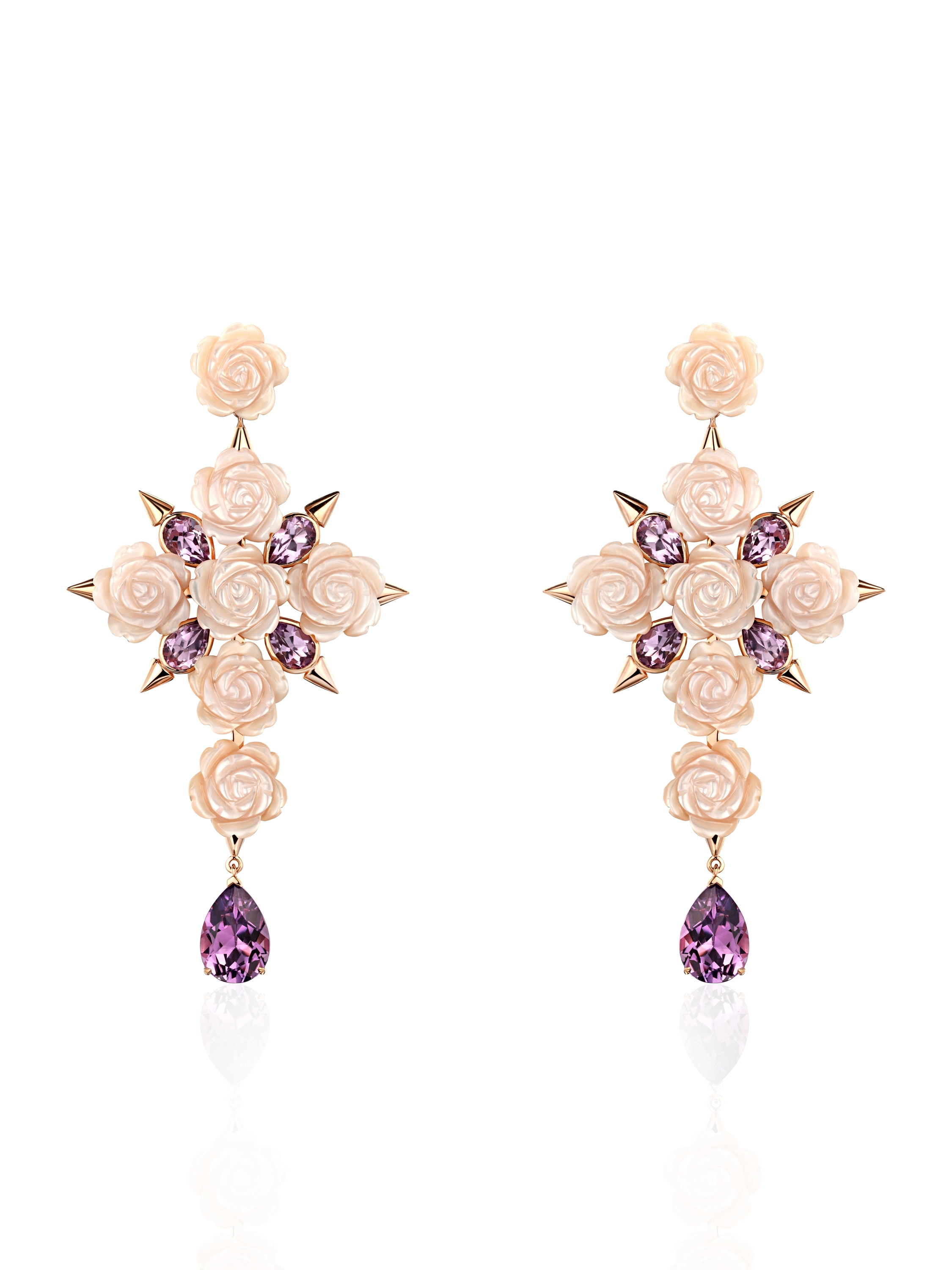 Earrings in rose gold with 14 carved mother-of-pearl roses with a total weight of 24.30 ct and 10 pear-cut amethysts with a total weight of 6.65 ct. Item weight: 16.13 g. Length – 7 cm.