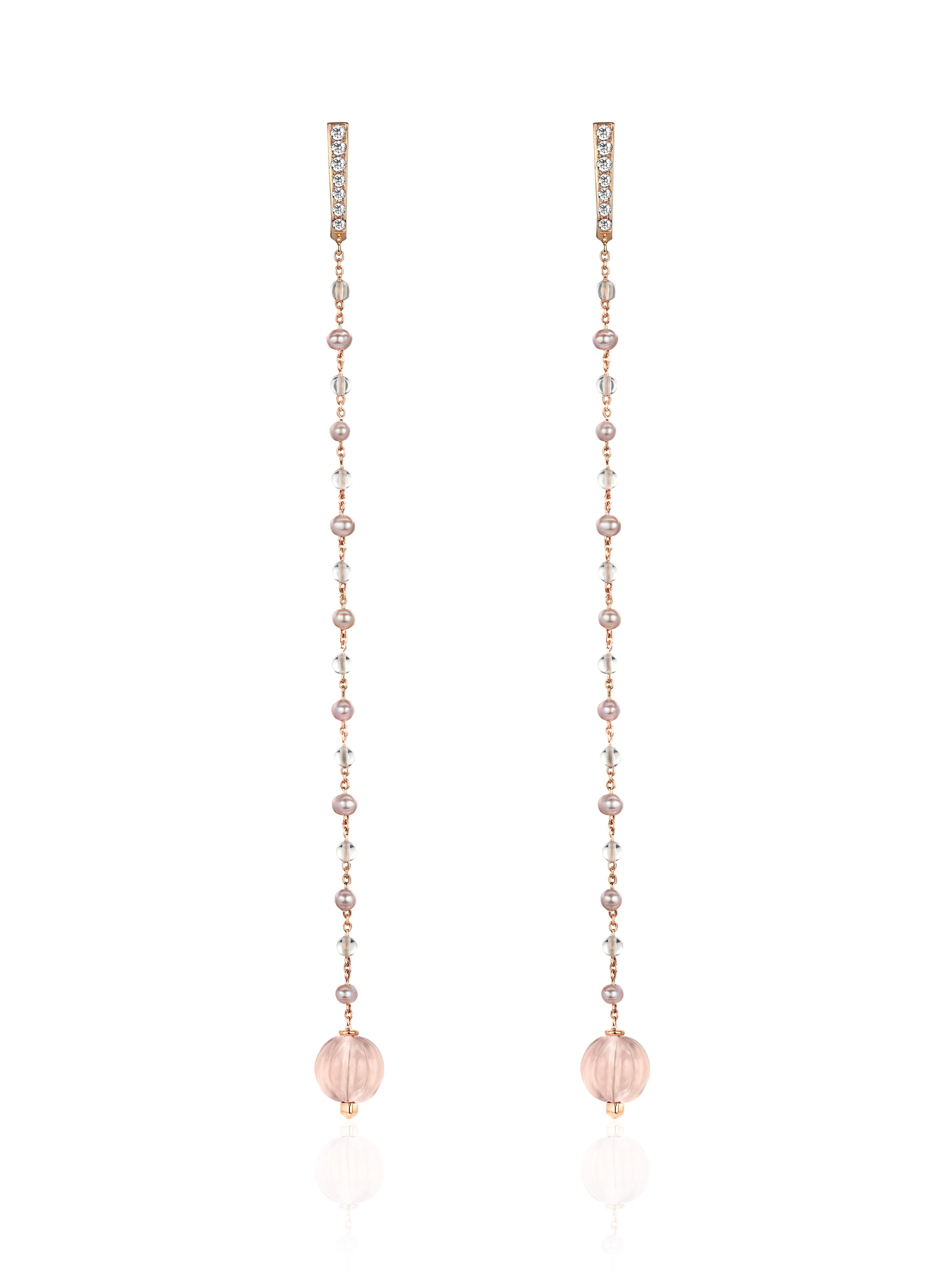 Rose gold earrings set with 2 pink quartz beads with a total weight of 6.99 ct, 14 colorless round topazes with a total weight of 0.30 ct, 16 pearls with a total weight of 1.62 ct, and 16 rock crystal beads with a total weight of 1.32 ct. Item weight: 5.11 g. Length – 11 cm.