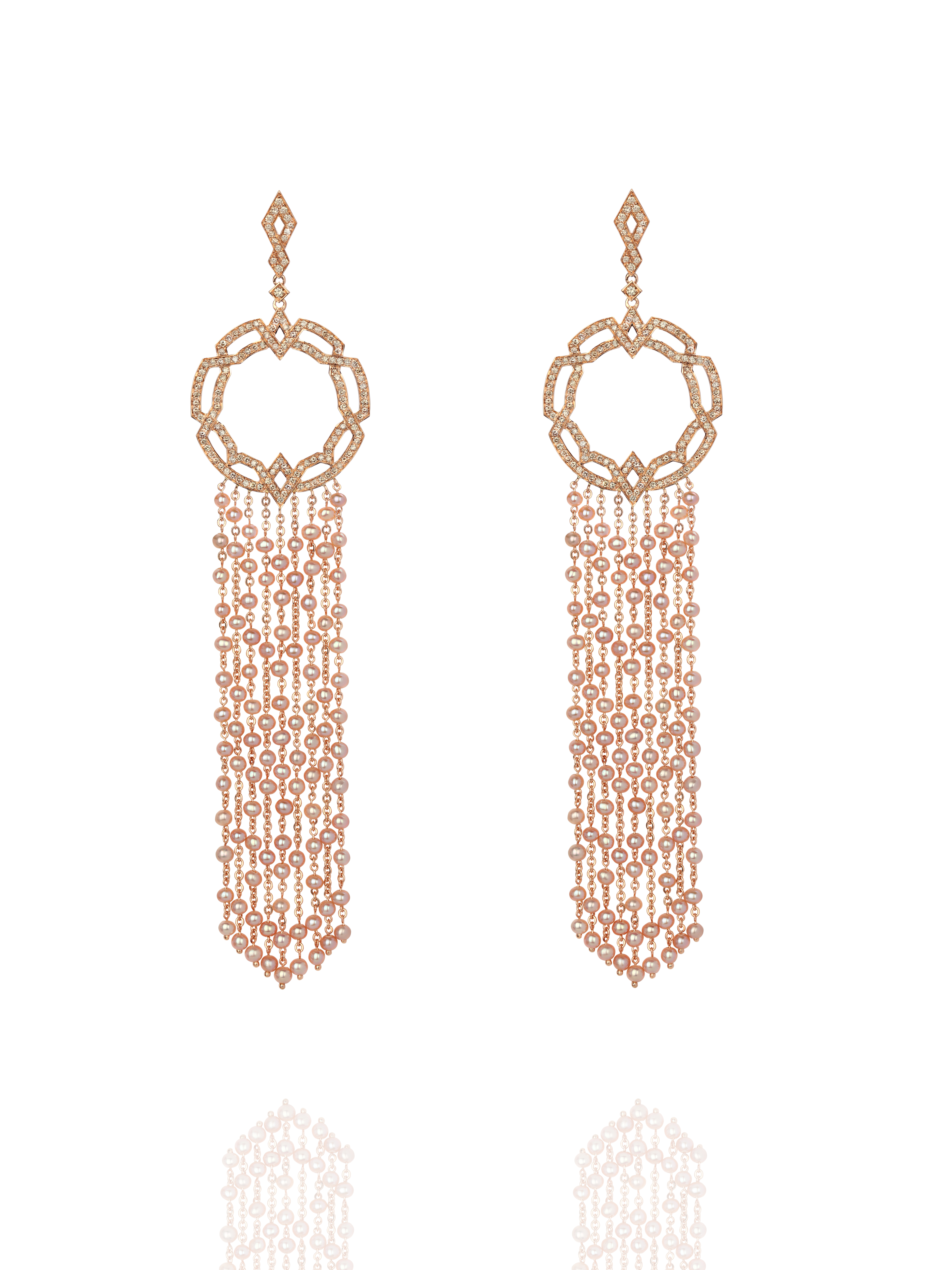 Earrings in rose gold, set with 306 round brown diamonds with a total weight of 1.86 ct and 202 pearls with a total weight of 4.14 g, d 2.5. Item length: 12 cm.