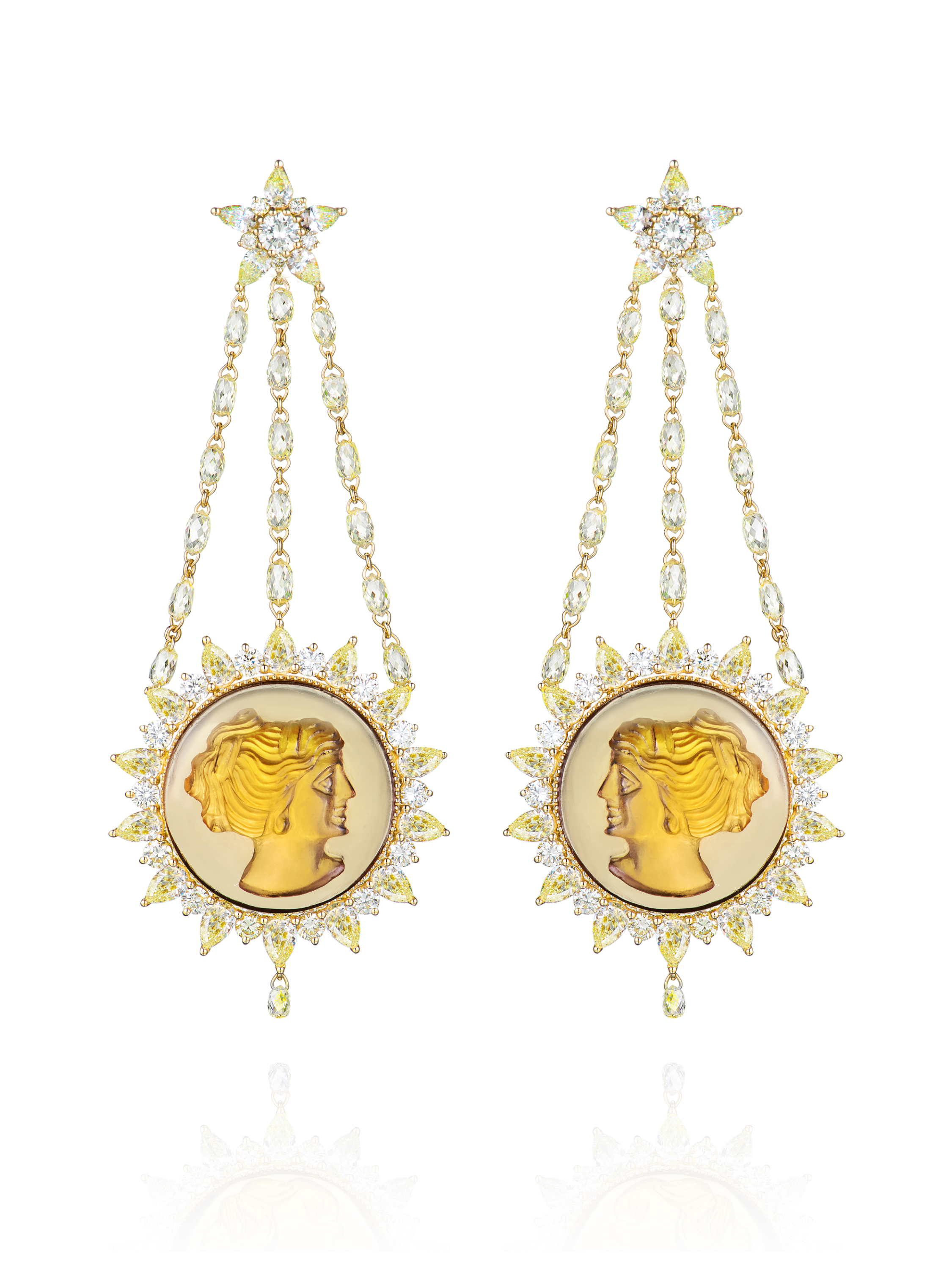 Yellow gold earrings with 2 cameos on carnelian with a total weight of 3.49 g, 38 pear-cut yellow diamonds with a total weight of 2.60 ct, 40 yellow round diamonds with a total weight of 0.98 ct and 36 briolette-cut yellow diamonds with a total weight of 5.40 ct. Item length: 6 cm.