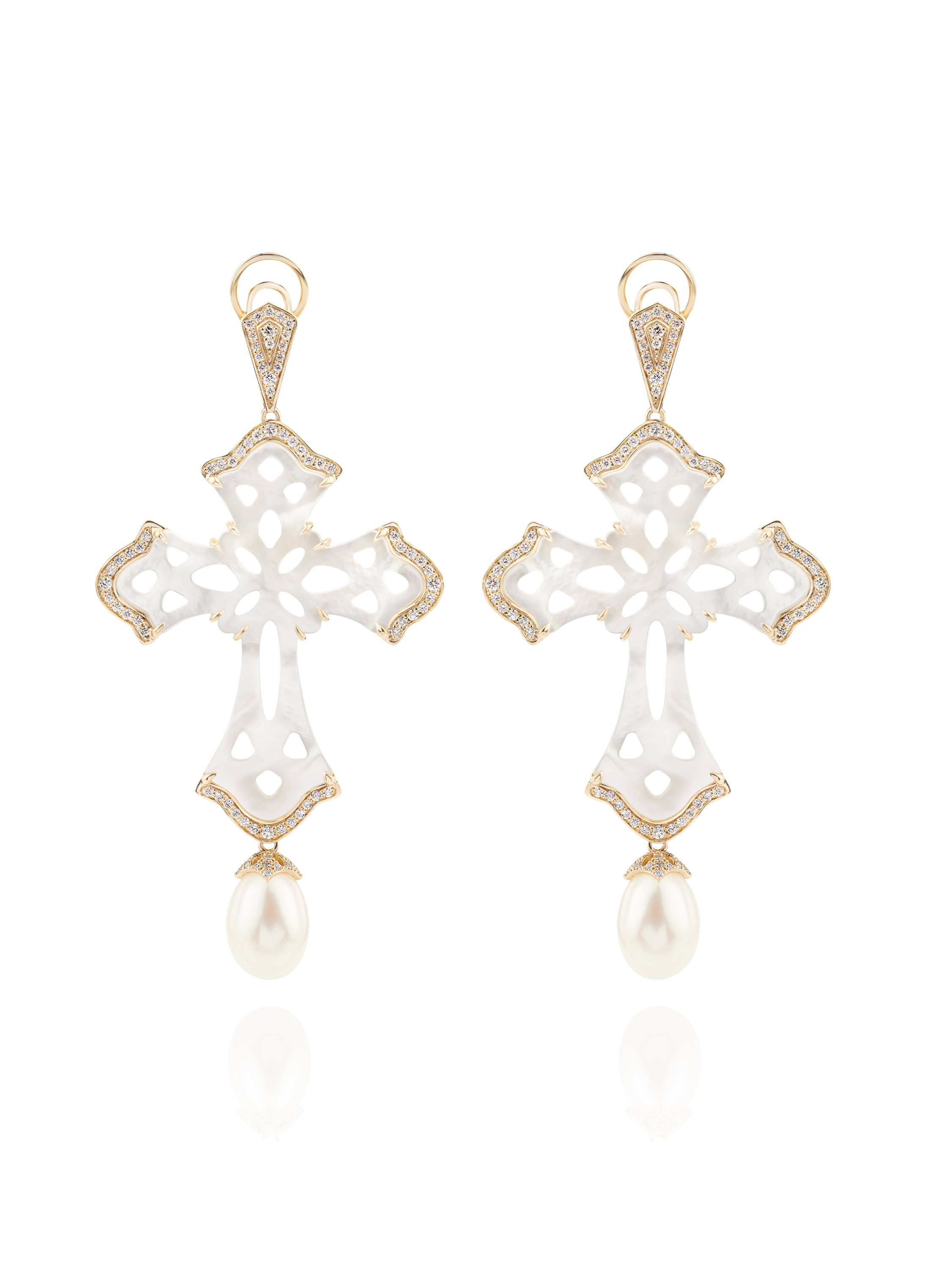 Yellow gold earrings with 2 mother-of-pearl crosses weighing 16.40 ct, 2 white pearls weighing 2.61 g and 170 round-cut diamonds weighing 0.95 ct. Item length: 6.5 cm.
