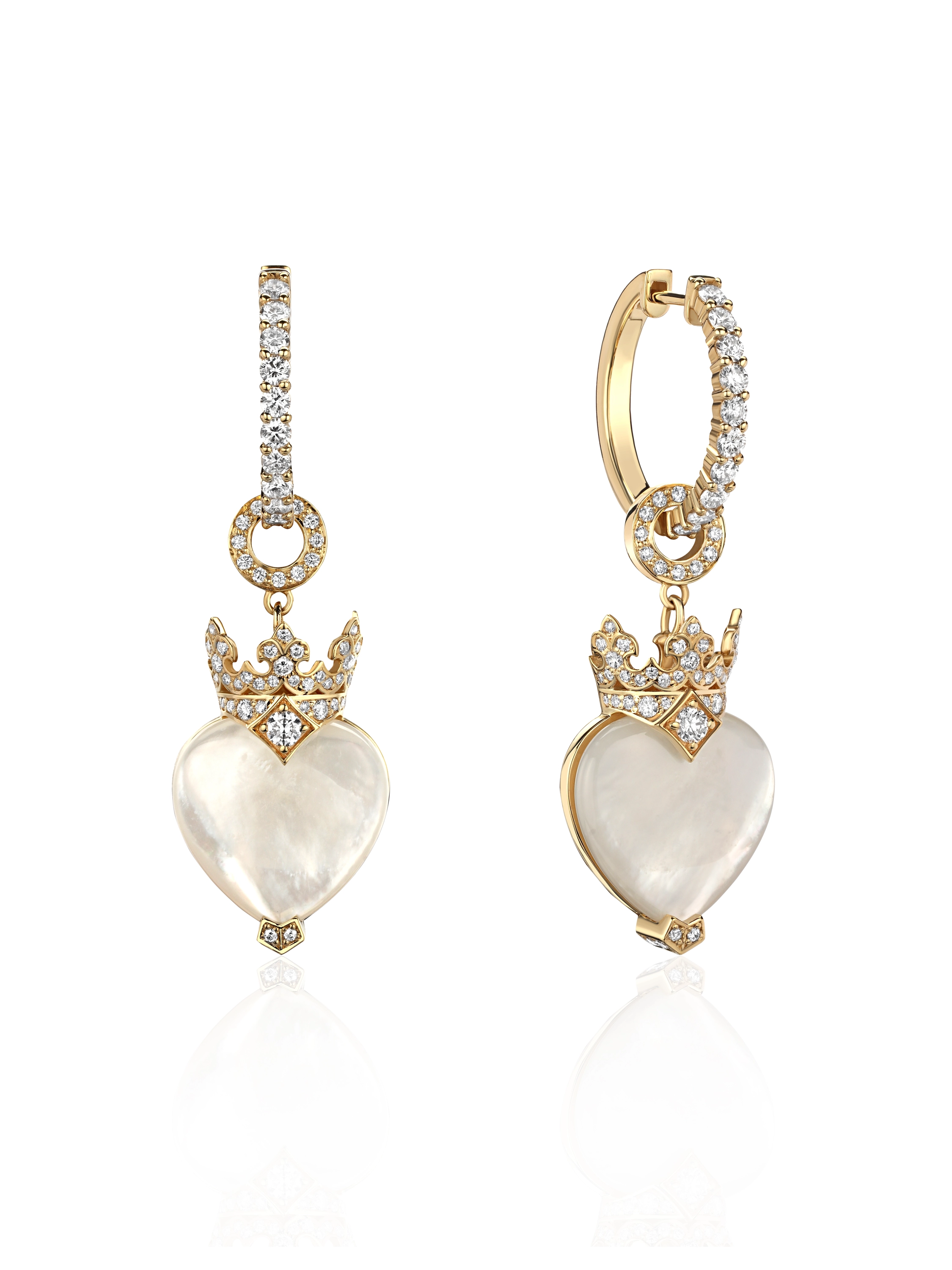 Transformer earrings crafted from 18K yellow gold with pendants of 2 heart-shaped mother-of-pearl stones weighing 11.25 ct and 136 round-cut diamonds with a total weight of 1.10 ct. Item weight: 9.45 g. Item length: 4 cm.