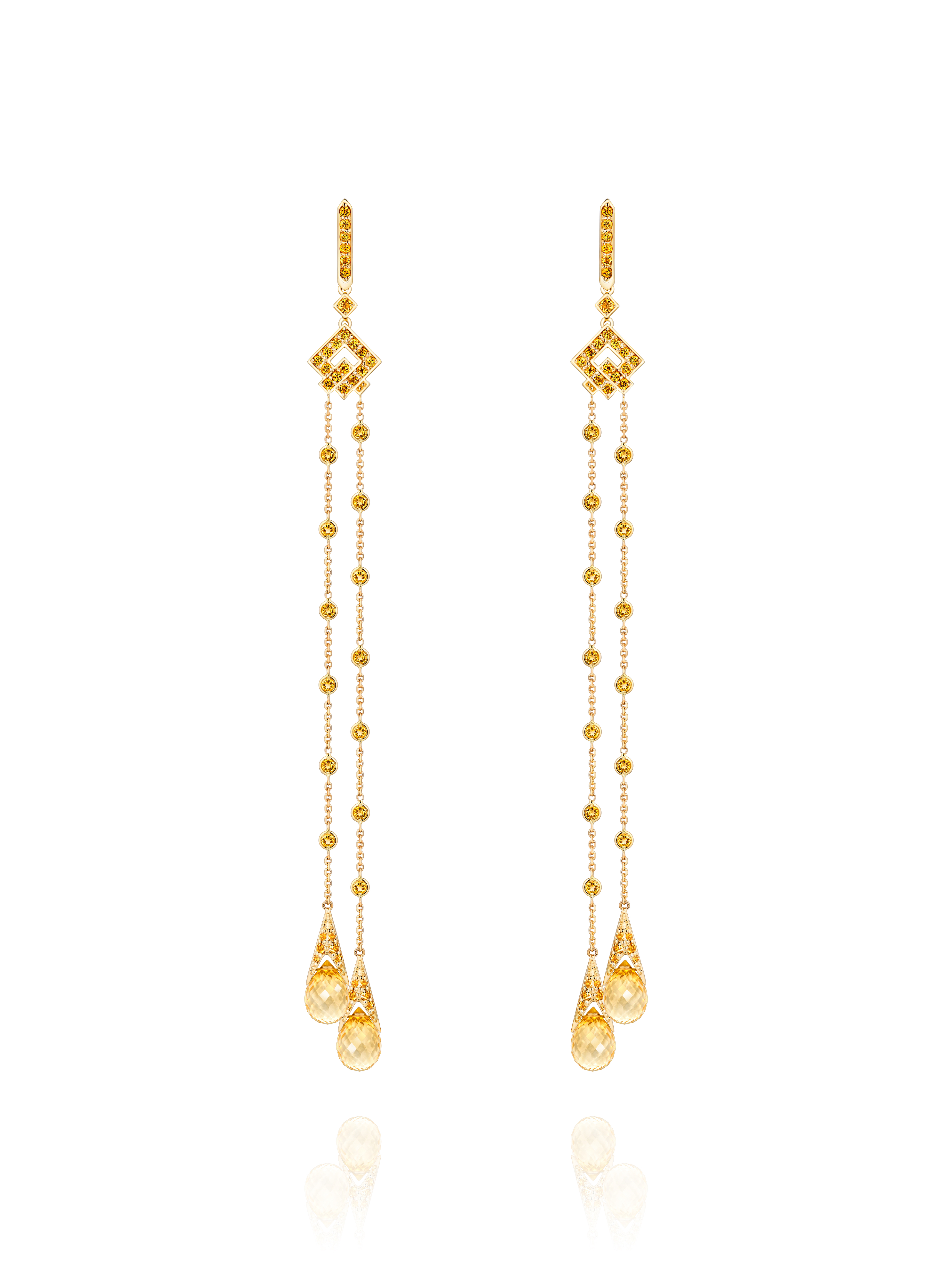 Earrings made of yellow gold, inlaid with 4 briolette-cut citrines with a total weight of 12.10 ct and 124 citrines with a total weight of 3.00 ct. Item length 12 cm.