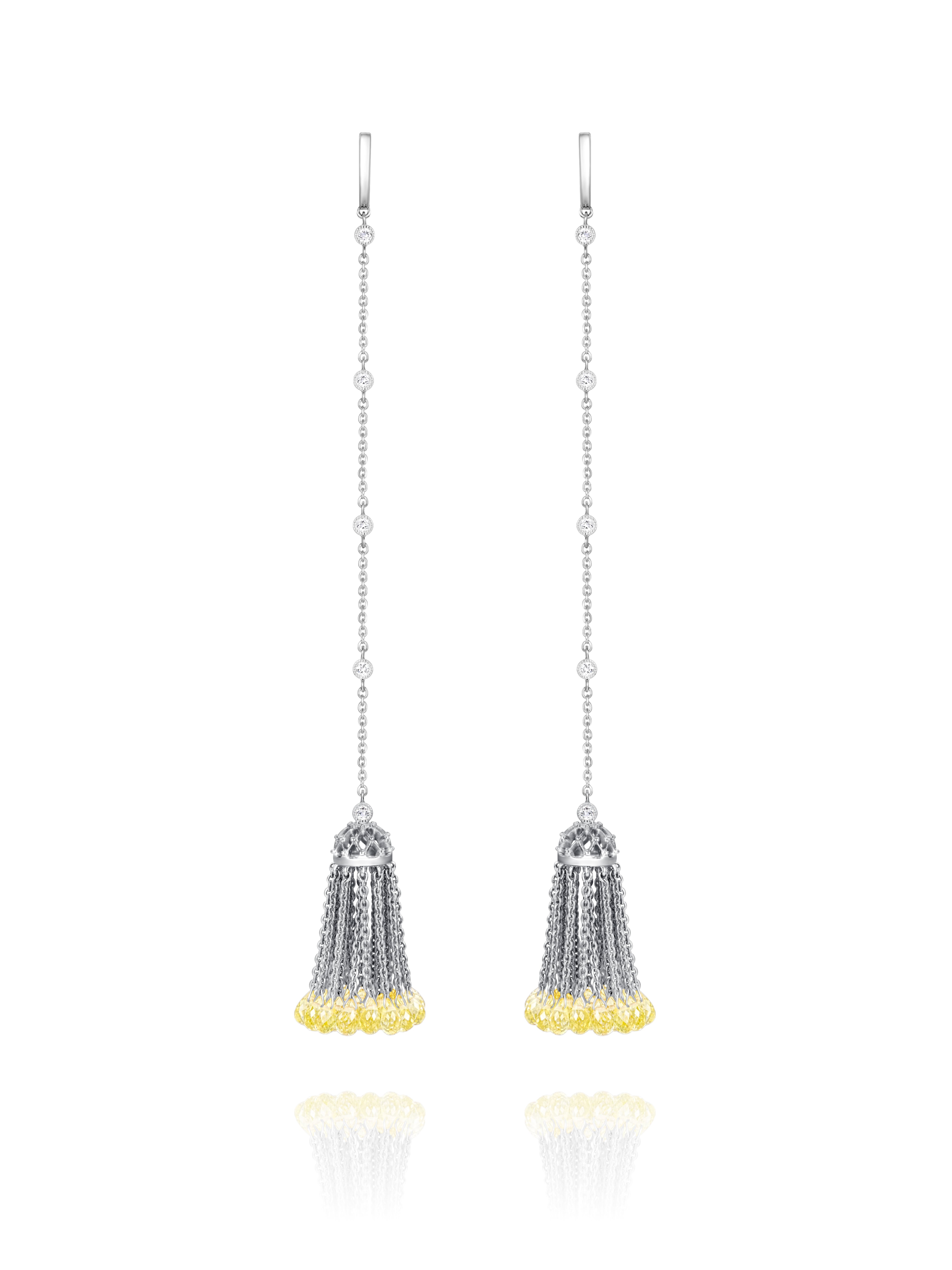 Tassel earrings made of white gold with 50 lemon quartz beads in briolette cut with a total weight of 14.07 ct and 10 colorless round-cut topazes with a total weight of 0.4 ct. Length of the piece – 12 cm.