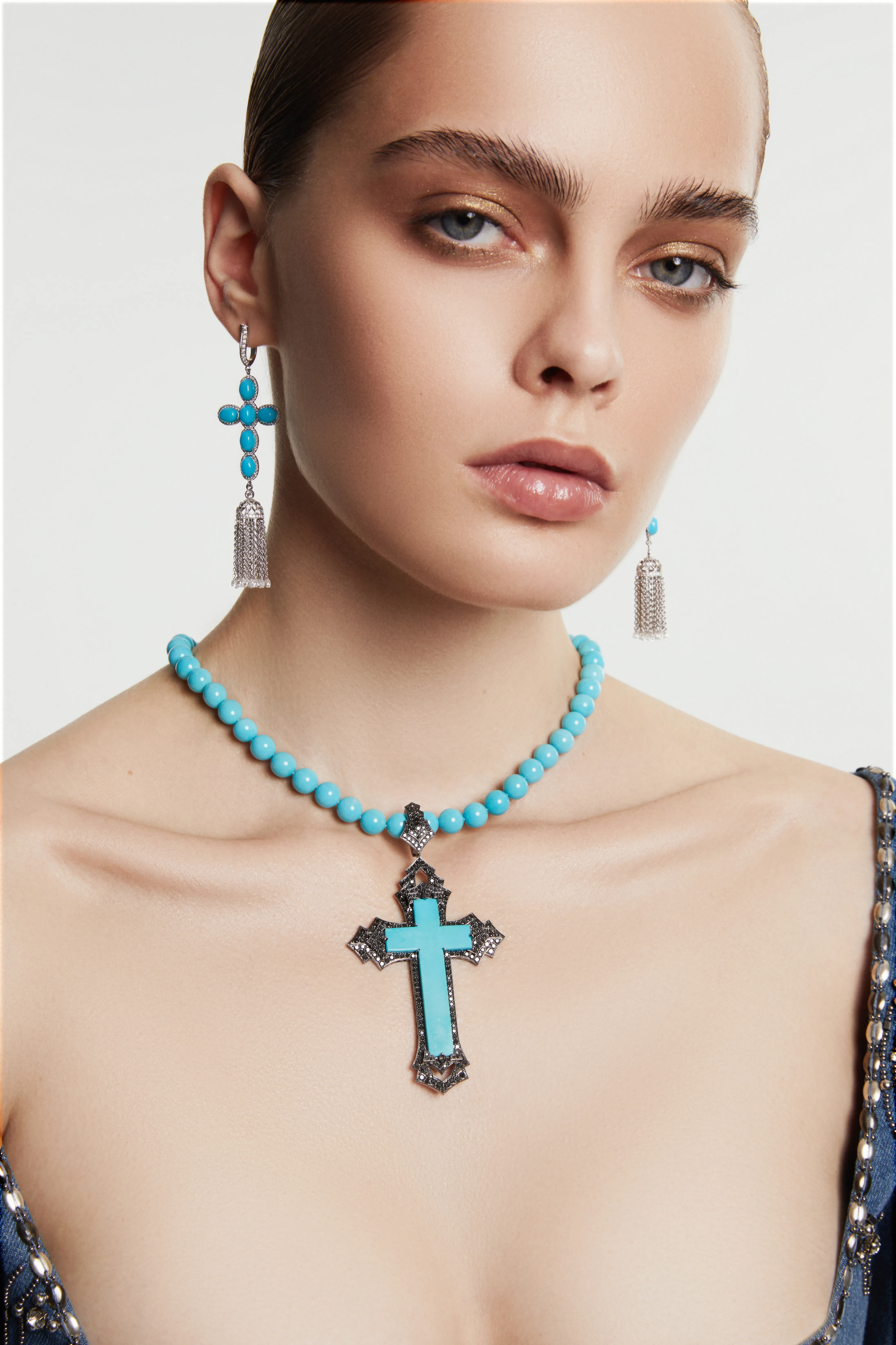 Tassel earrings in white gold with 12 oval turquoise cabochons with a total weight of 8.7 g, 380 round-cut diamonds with a total weight of 1.29 ct, and 50 briolette-cut diamonds with a total weight of 4.23 ct. Item length: 8 cm. Weight – 12.67 g.