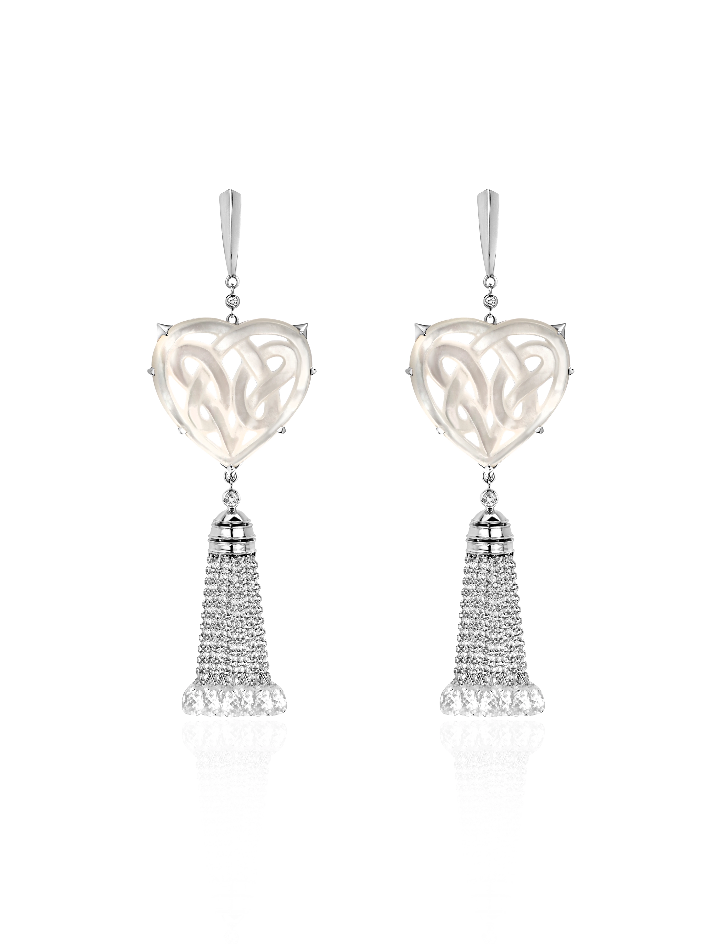Tassel earrings in white gold with 30 briolette-cut rock crystals with a total weight of 9.55 ct, 2 heart-shaped mother-of-pearl stones with a total weight of 10.86 ct, and 4 round-cut topazes with a total weight of 0.08 ct. Item length: 7 cm. Weight – 15.31 g.