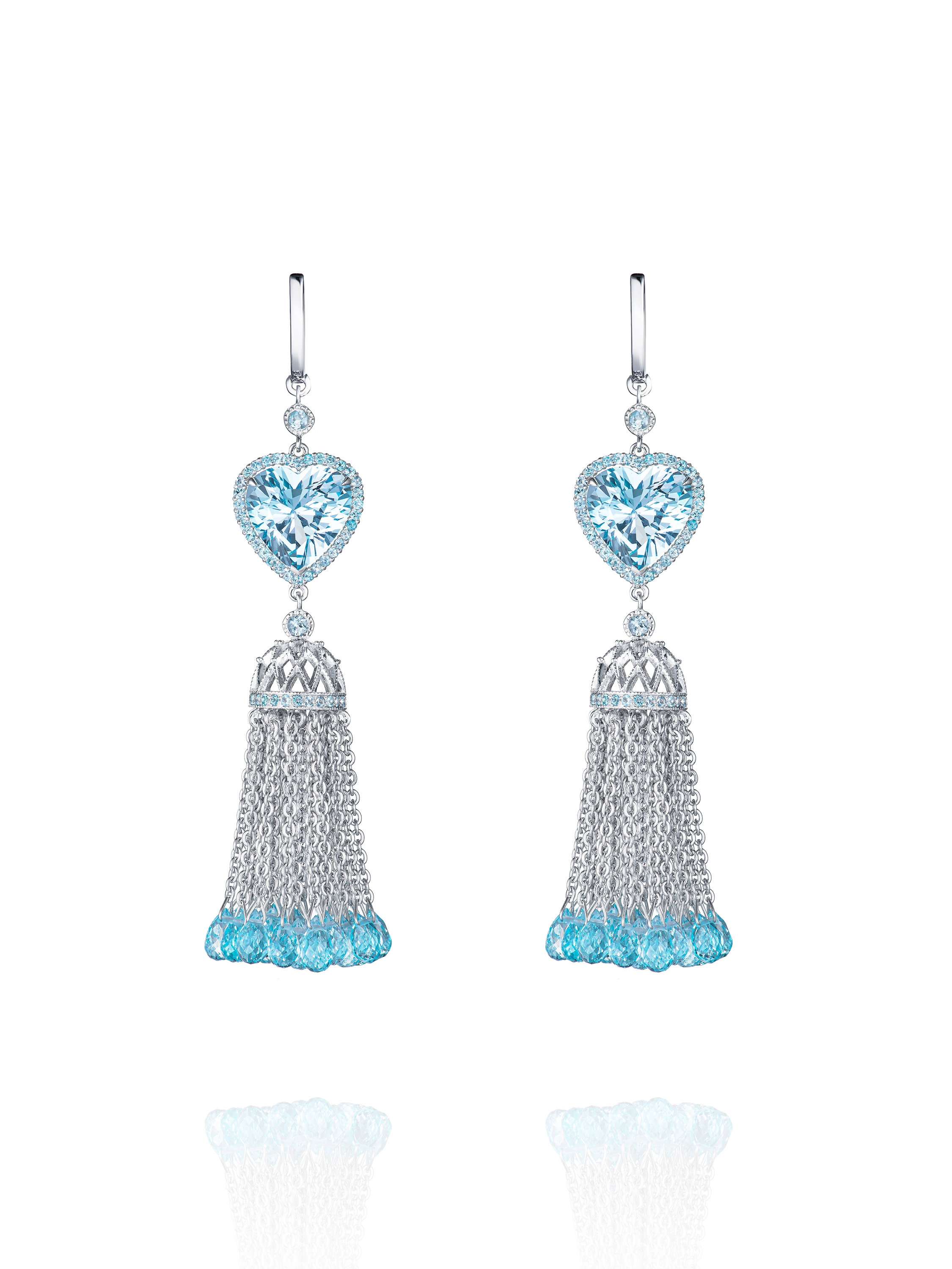 Tassel earrings in white gold, set with 50 Sky Blue topaz briolettes with a total weight of 18.47 ct, 2 Sky Blue heart-cut topazes with a total weight of 8.70 ct and 114 round Sky Blue topazes 0.76 ct. Length – 6 cm.