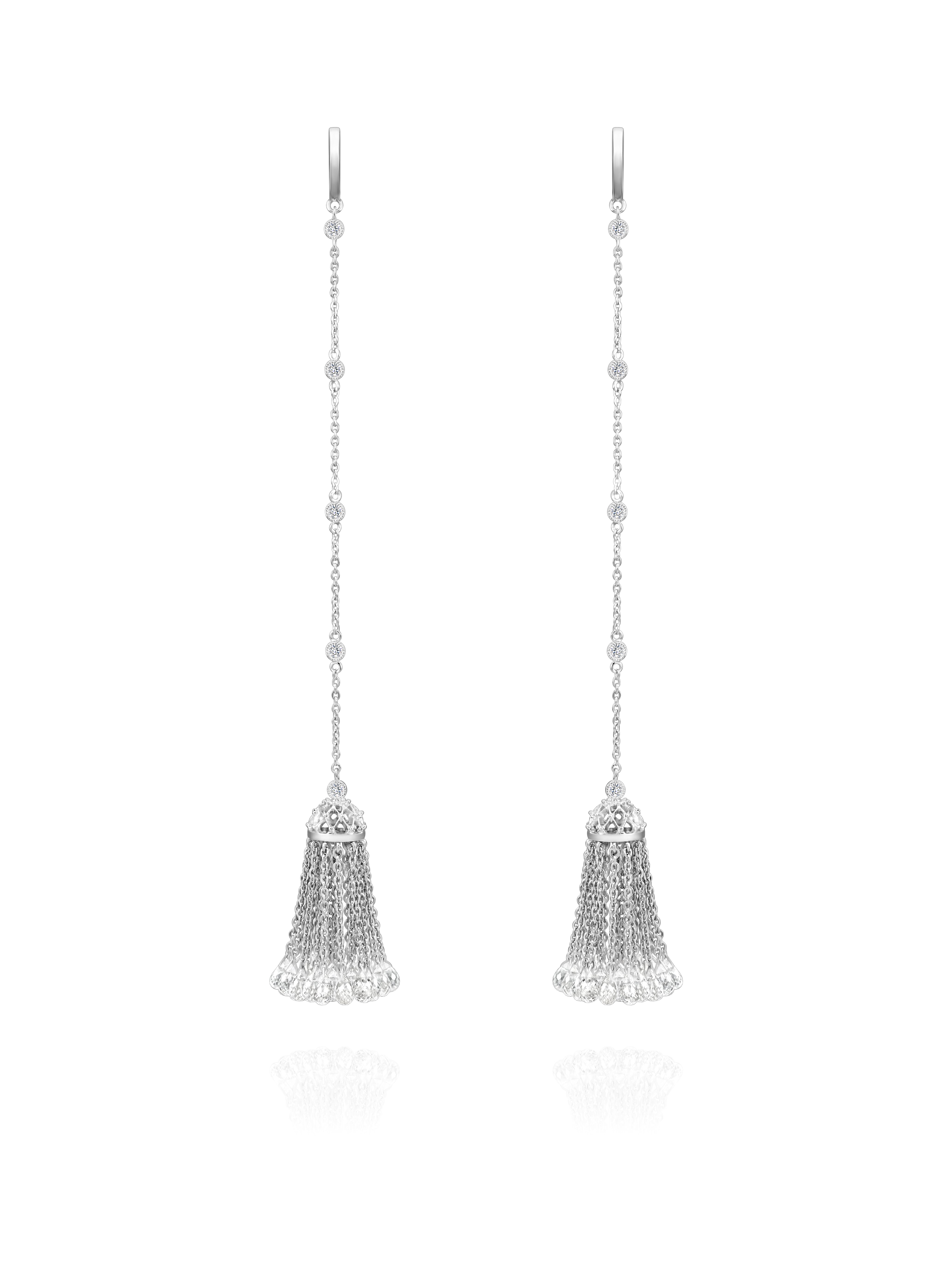 Tassel earrings made of 585 white gold, inlaid with 10 colorless topazes weighing 0.4 ct and briolette-cut rock crystal with a total weight of 14.09 ct. Item length – 12 cm.