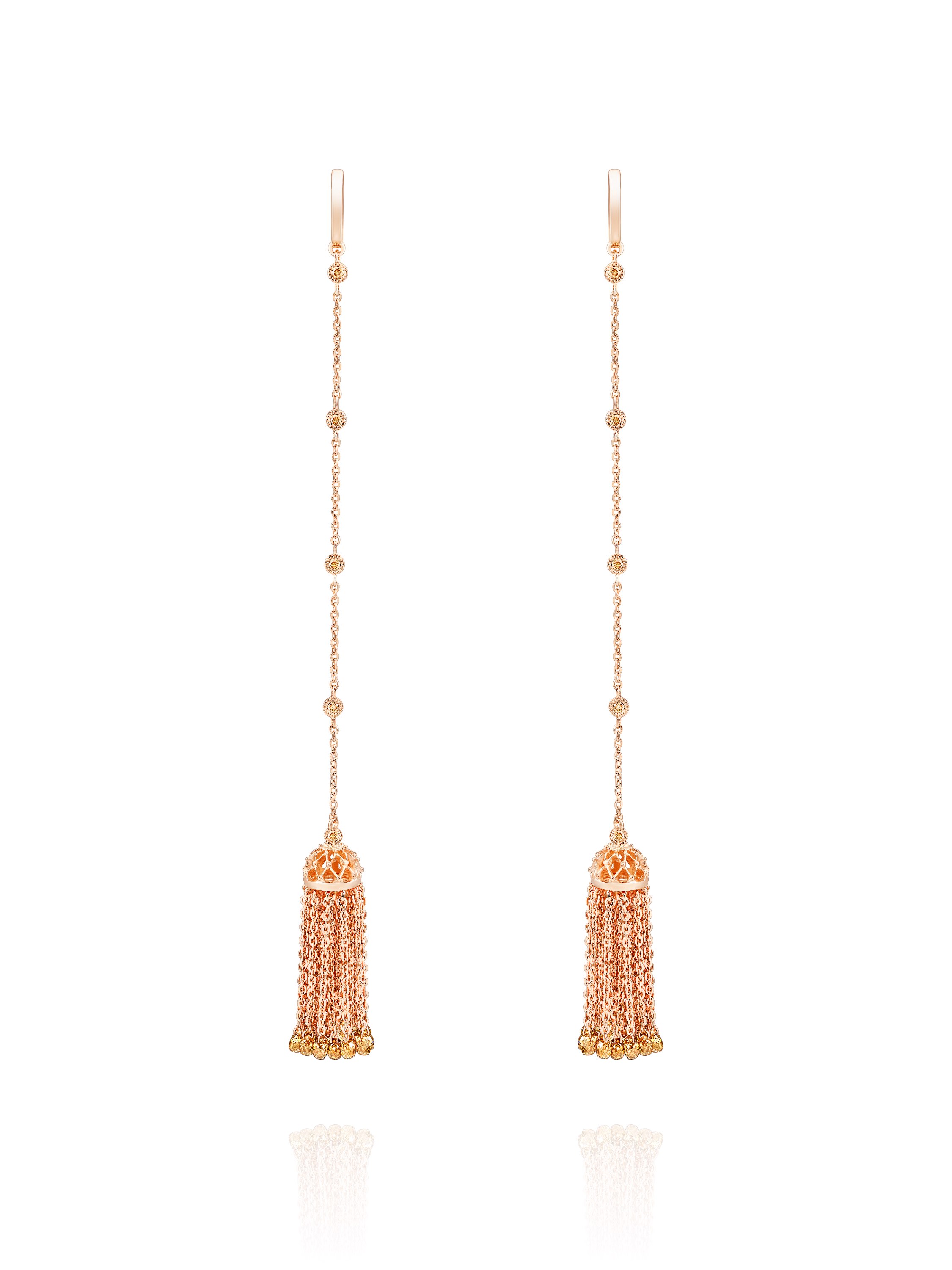Pink gold tassel earrings with 50 brown diamond briolettes weighing 4.32 ct and 10 round diamonds weighing 0.31 ct. Item length: 12 cm.