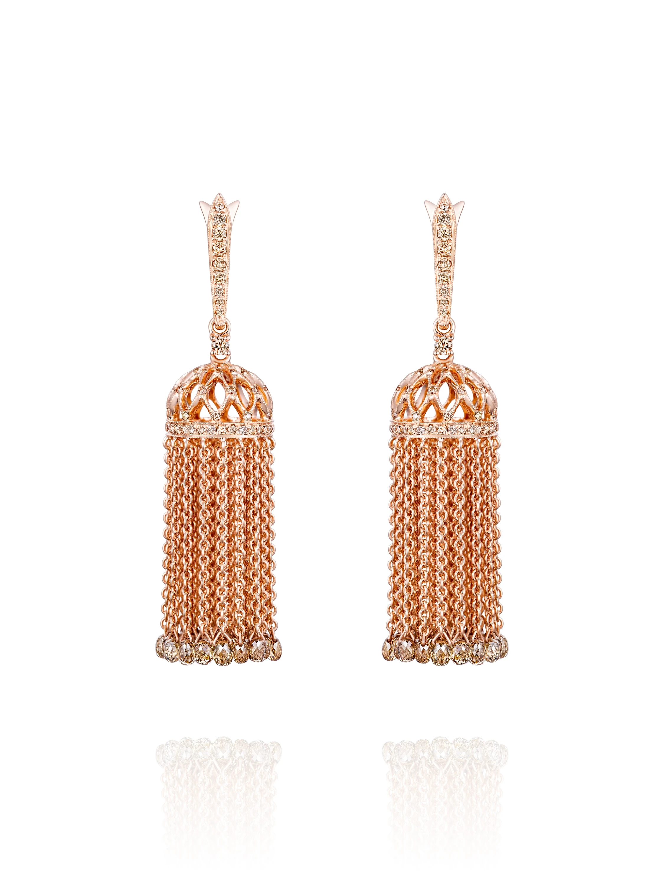 Tassel earrings in rose gold with 66 brown briolette-cut diamonds with a total weight of 6.09 ct and 130 round-cut diamonds with a total weight of 1.54 ct. Item length: 5 cm.