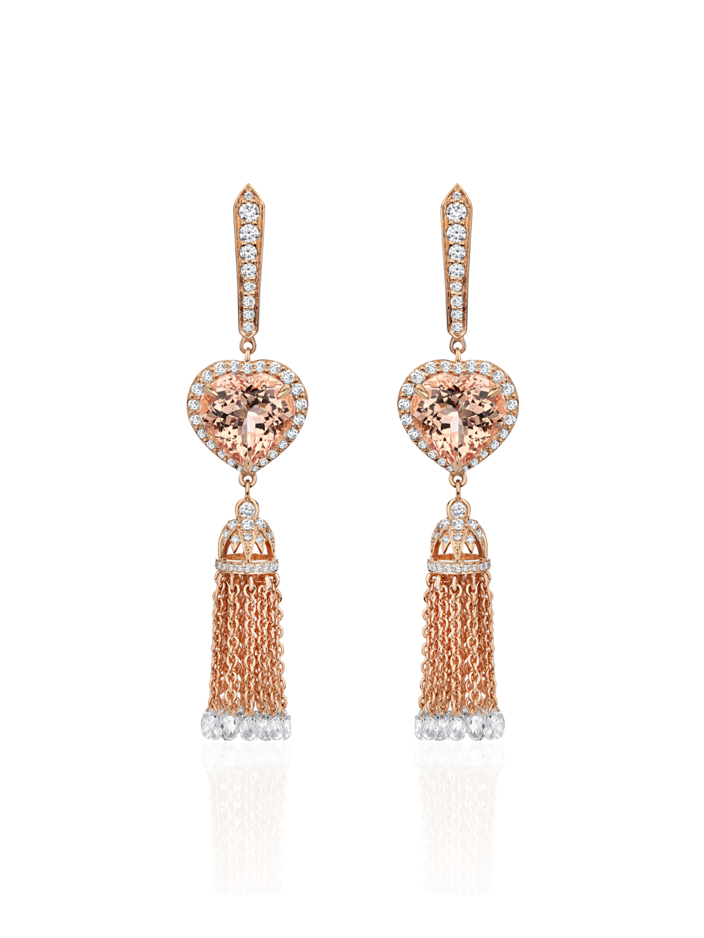Tassel earrings in rose gold with 2 heart-cut morganites with a total weight of 7.07 ct, 42 briolette-cut diamonds with a total weight of 3.88 ct, and 146 round-cut diamonds with a total weight of 1.18 ct. Item length: 6 cm.