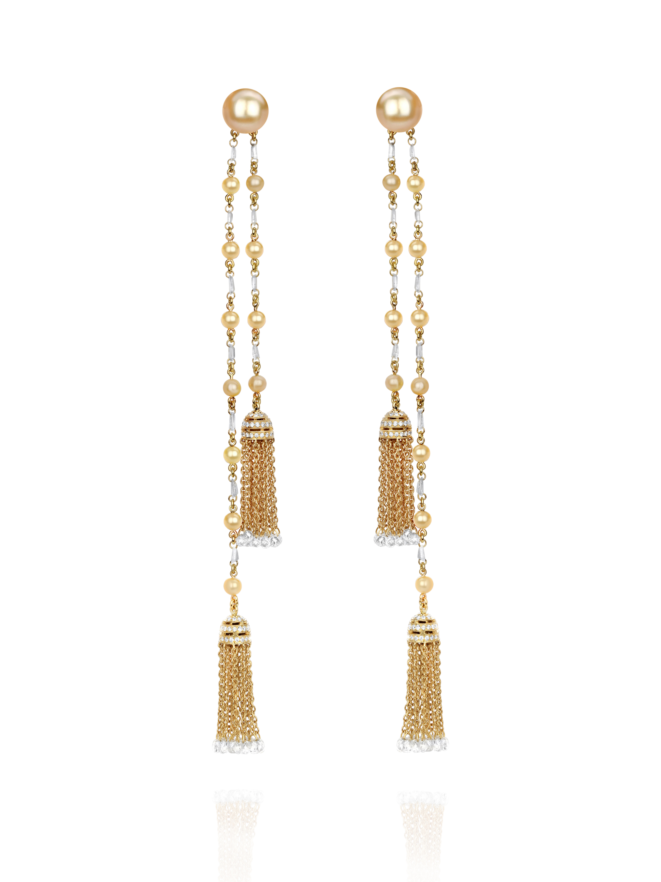 Tassel earrings in yellow gold, set with 24 golden pearls with a total weight of 3.04 g, 176 round-cut diamonds with a total weight of 0.73 ct, 60 briolette-cut diamonds with a total weight of 5.25 ct, and 22 fancy-cut diamonds with a total weight of 1.12 ct.