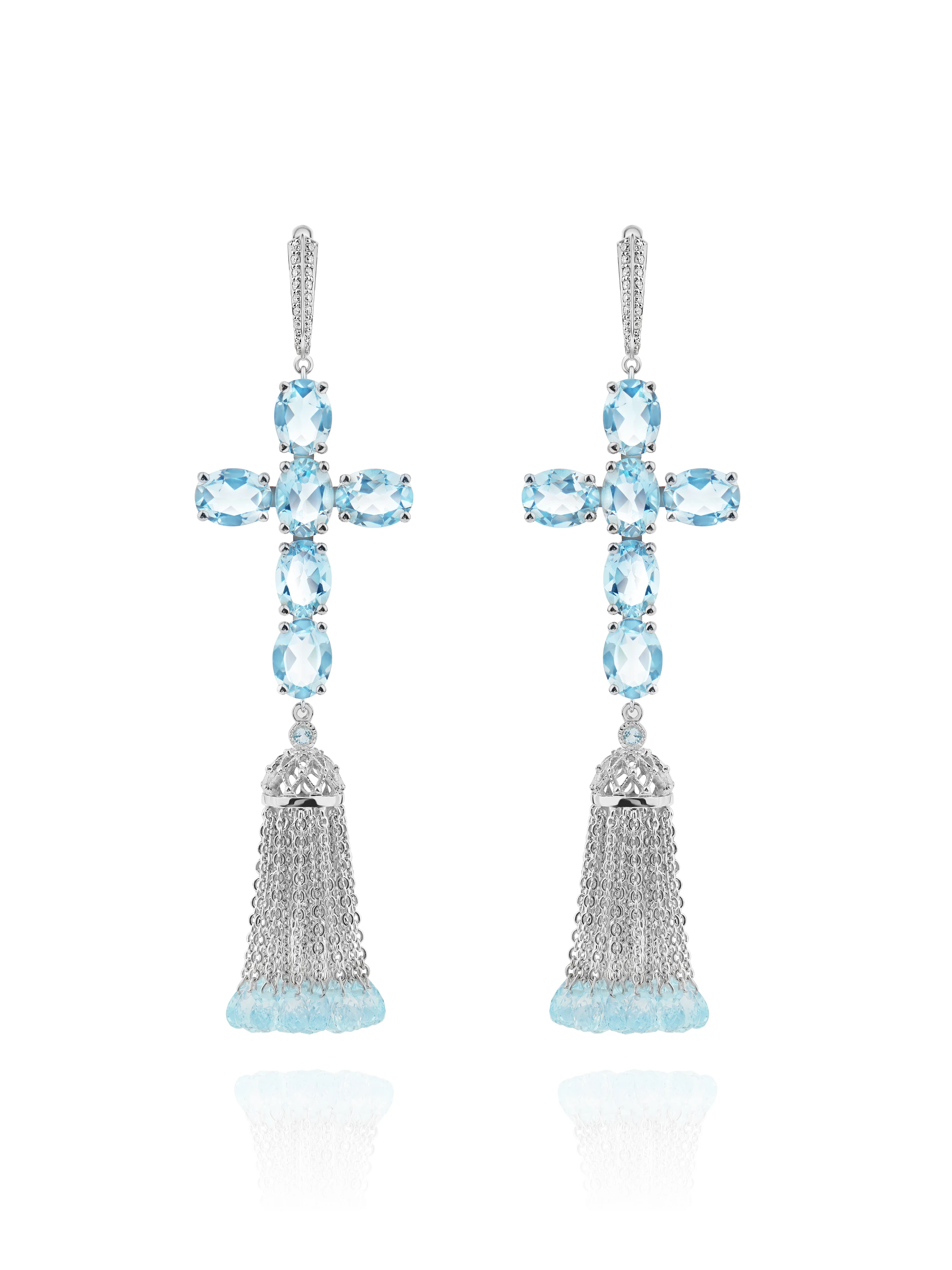 Tassel earrings with crosses in white gold with Sky Blue topazes