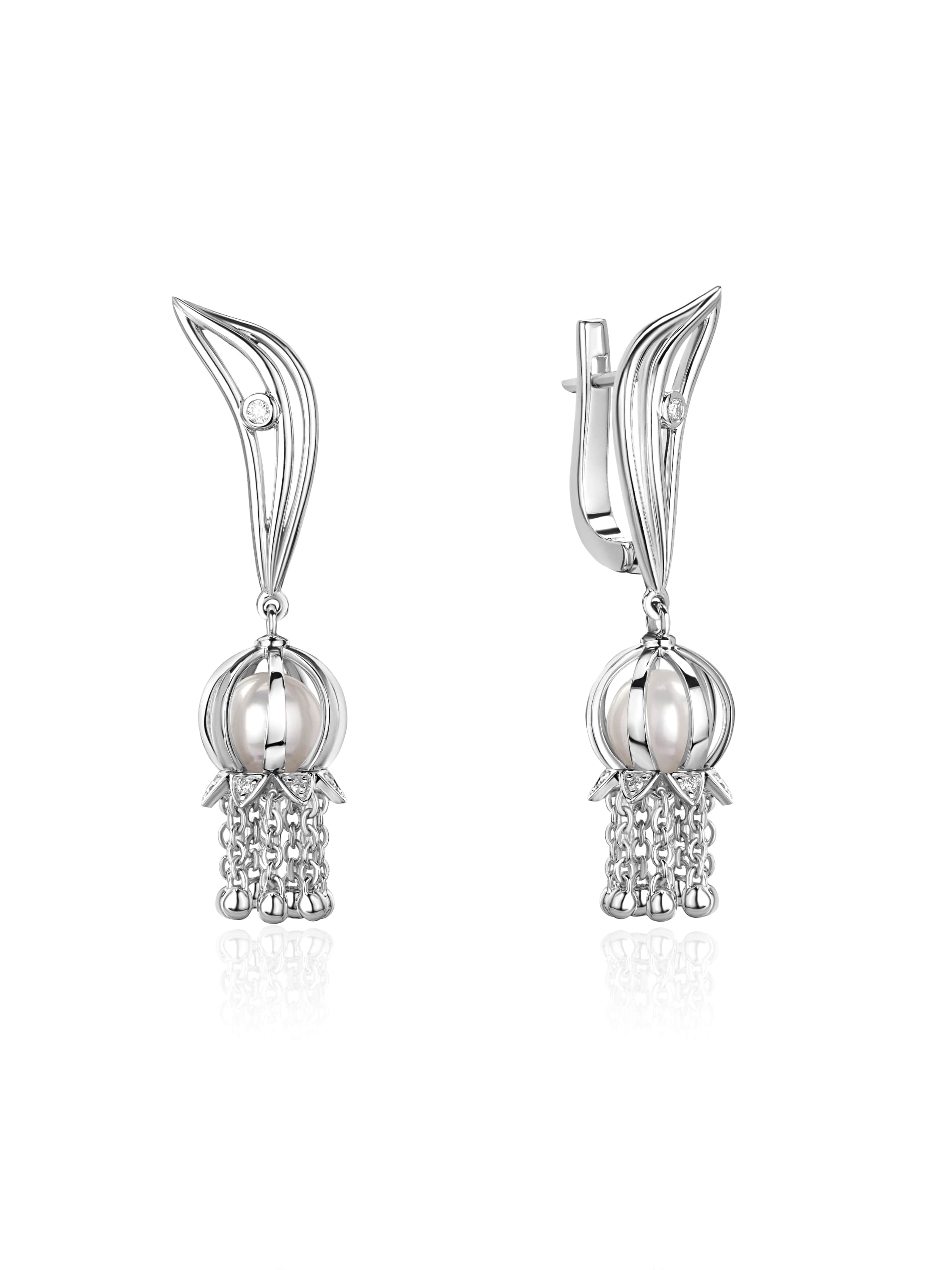 Bell-shaped earrings made of white gold, inlaid with 2 pearls weighing 0.70 and 16 round-cut diamonds with a total weight of 0.09 ct. Length: 3.5 cm.