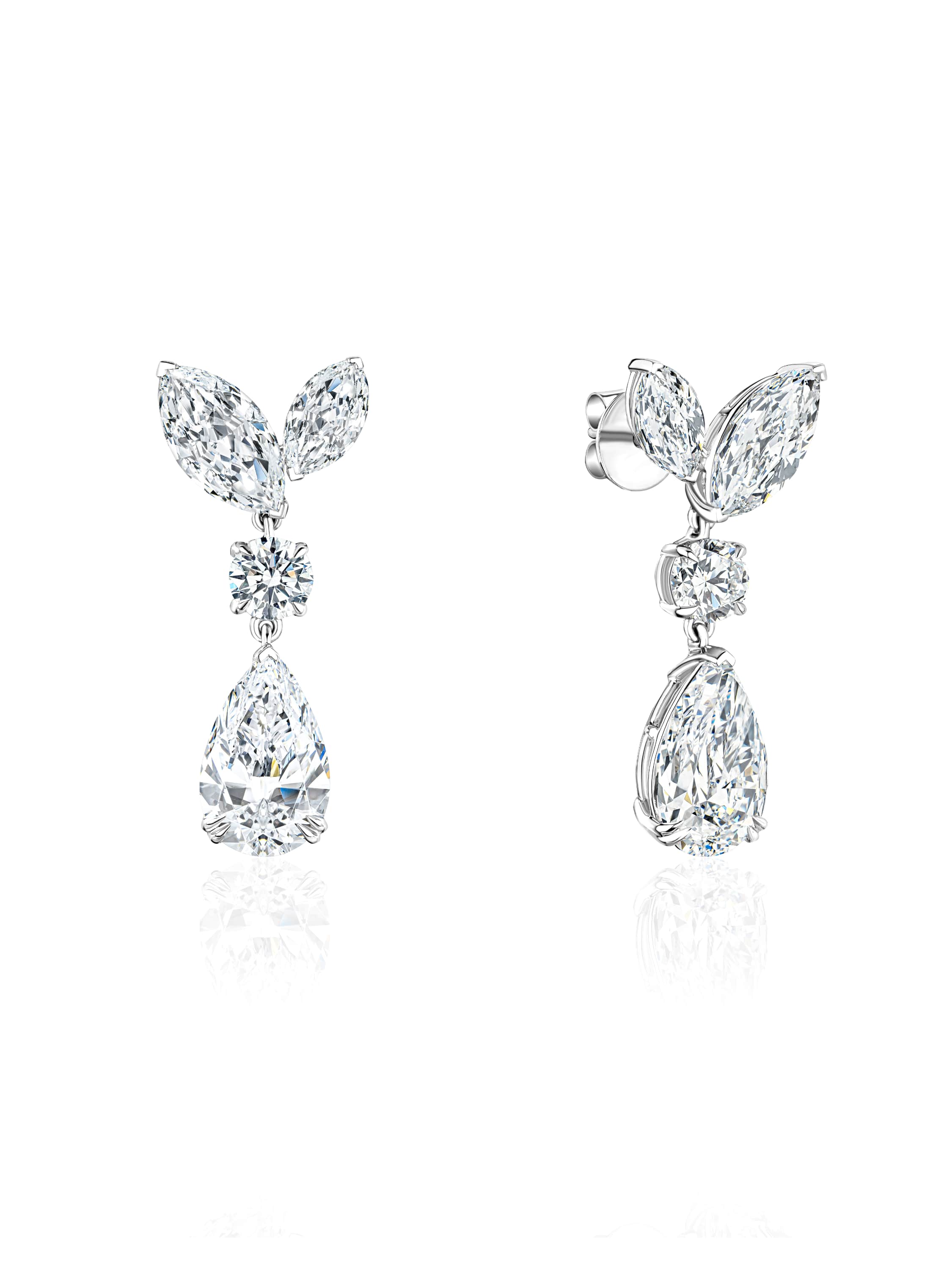 Earrings with 2 pear-cut LG diamonds of 8.05 ct F/VS1, 1 marquise-cut LG diamond of 2.01 ct D/VS1, 1 marquise-cut LG diamond of 2.01 ct F/VS1, and 2 round LG diamonds of 1.41 ct F/VS1. Item length: 2.5 cm.