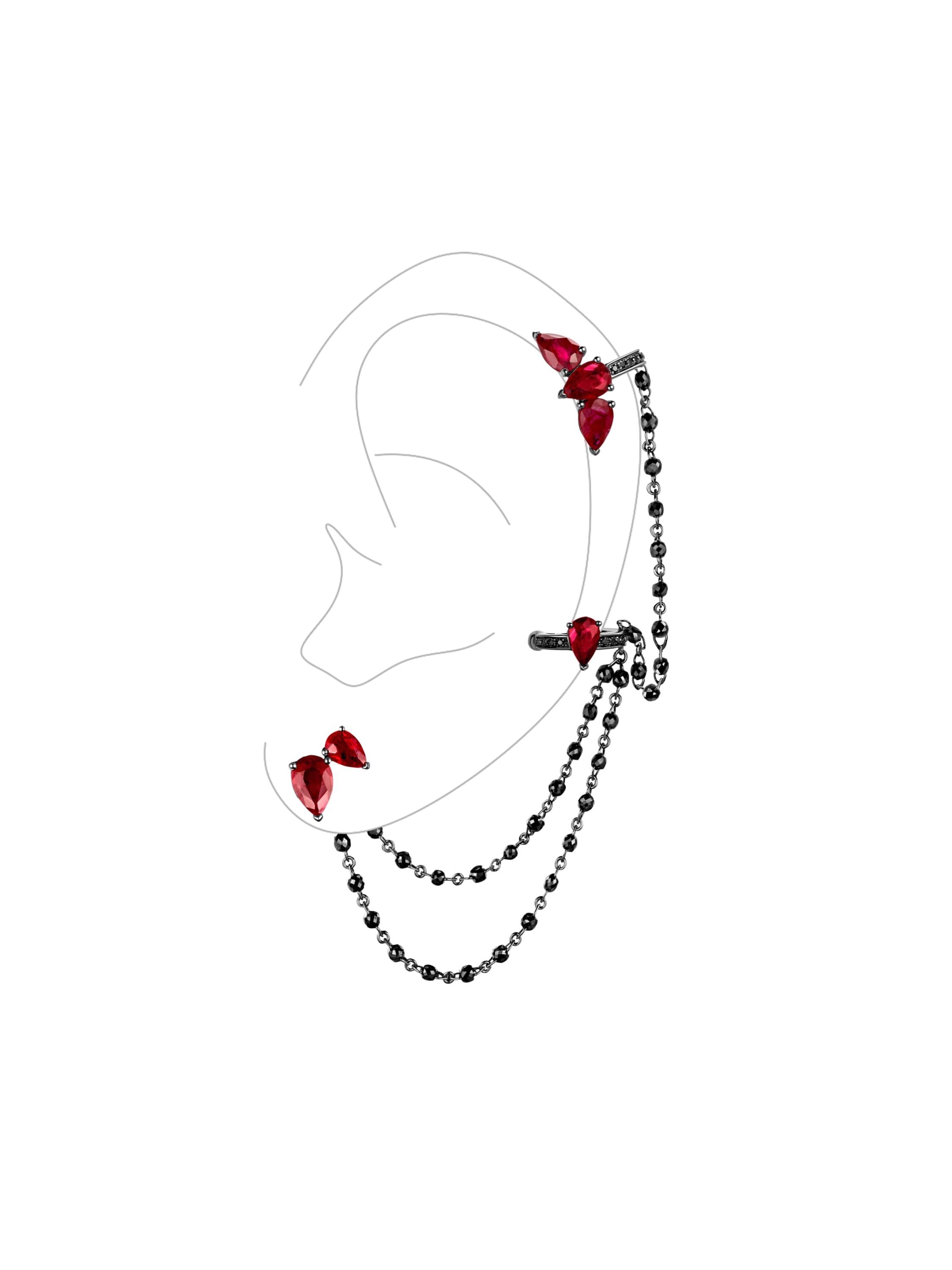 Earrings with ear cuff in blackened gold with 12 pear-cut rubies weighing 6.64 ct, 72 black diamonds weighing 6.82 ct, and 68 round-cut black diamonds weighing 0.31 ct.
